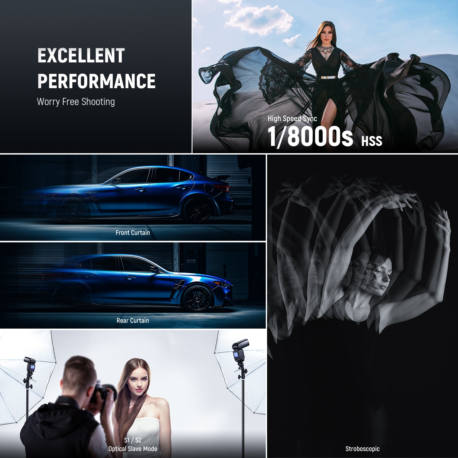 600Ws outdoor flash with app control, TTL/Manual/Multi modes, 5700K stable color, 400 full-power flashes, 30W bi-color LED lamp, 2.4G wireless, and Bowens mount for pro photo setups.