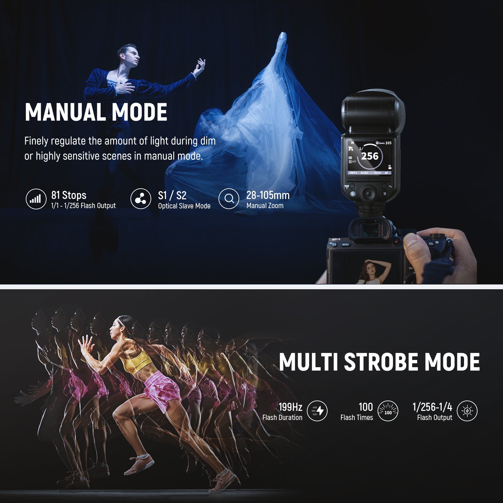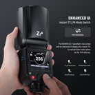 - Enhanced UI and TTL/M Mode Switch- This speedlight has an upgraded UI and a TCM key that switches from TTL to M mode in a second. It features automatic metering, 1/1-1/256 manual dimming, 28-105mm focal length, stroboscopic flashes, 1/8000s HSS, front/rear curtain sync, FEC/FEB/FEL (flash exposure compensation/bracketing/locking), S1/S2 optical slave modes, and other functions