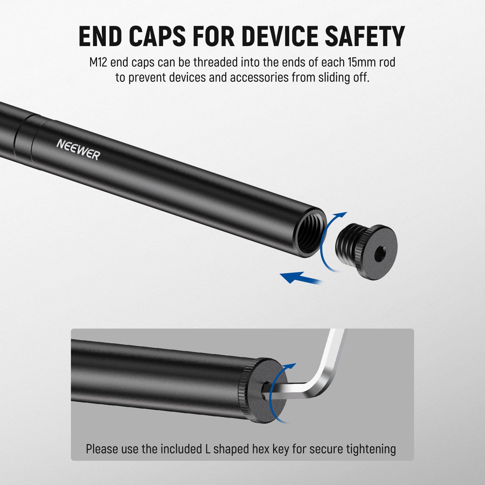 - End Caps for Device Safety- Install the M12x1.5 threaded end caps at the ends of each 15mm rod to prevent devices and accessories from falling off. Use the included L shaped hex key for a tight fit. Note: These end caps are only compatible with NEEWER aluminum alloy 15mm rods