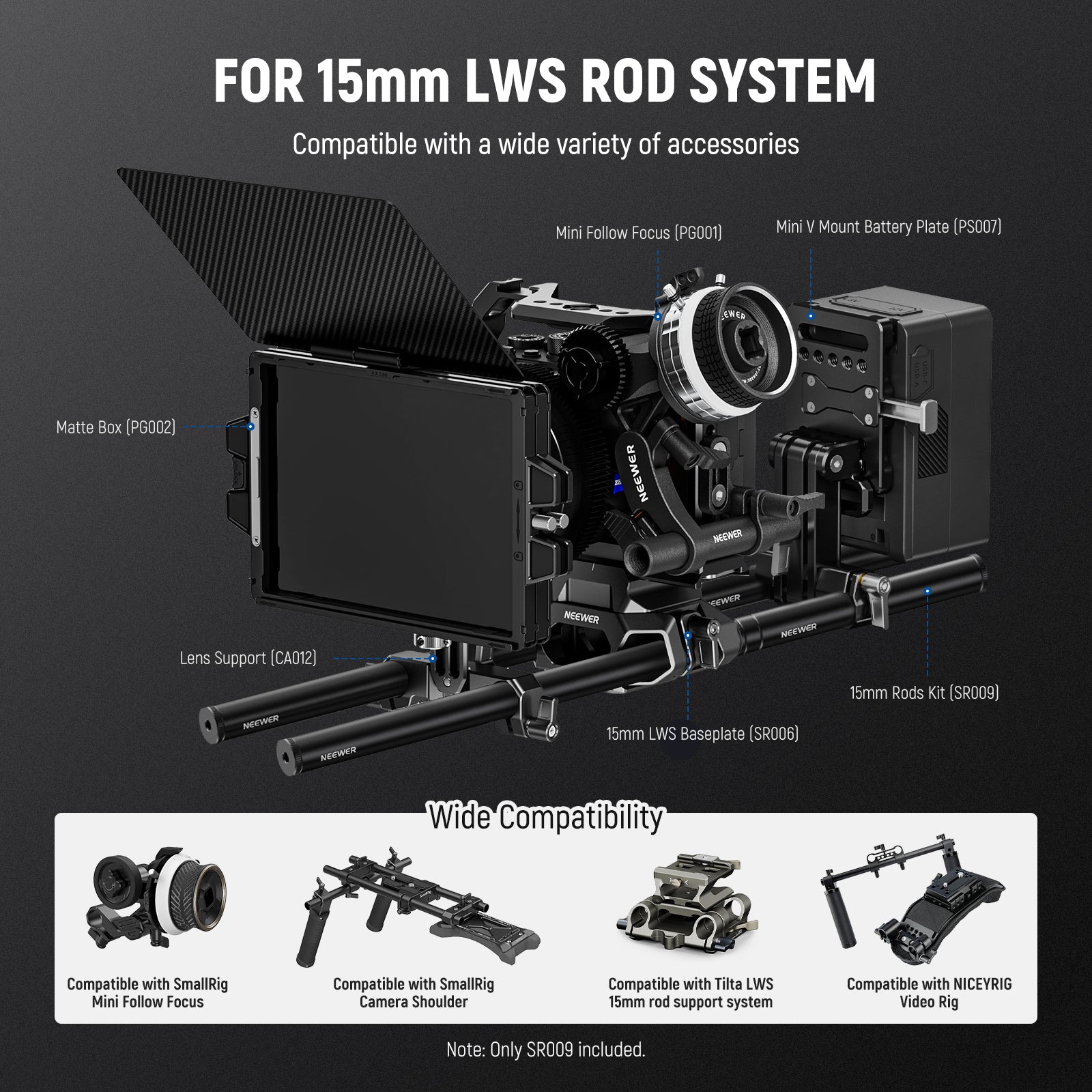 - For 15mm LWS Rod System- Compatible with a wide variety of accessories, such as NEEWER SR004 Shoulder Rig, SR006 Baseplate, PG002 Matte Box, PG001/PG003 Follow Focus, ST-43/PS007/VB-A1 V Mount Battery Plate, CA012 Lens Support, etc. Compatible with SmallRig shoulder rig follow focus, compatible with Tilta LWS 15mm rod support system, compatible with NICEYRIG video rig, and other accessories