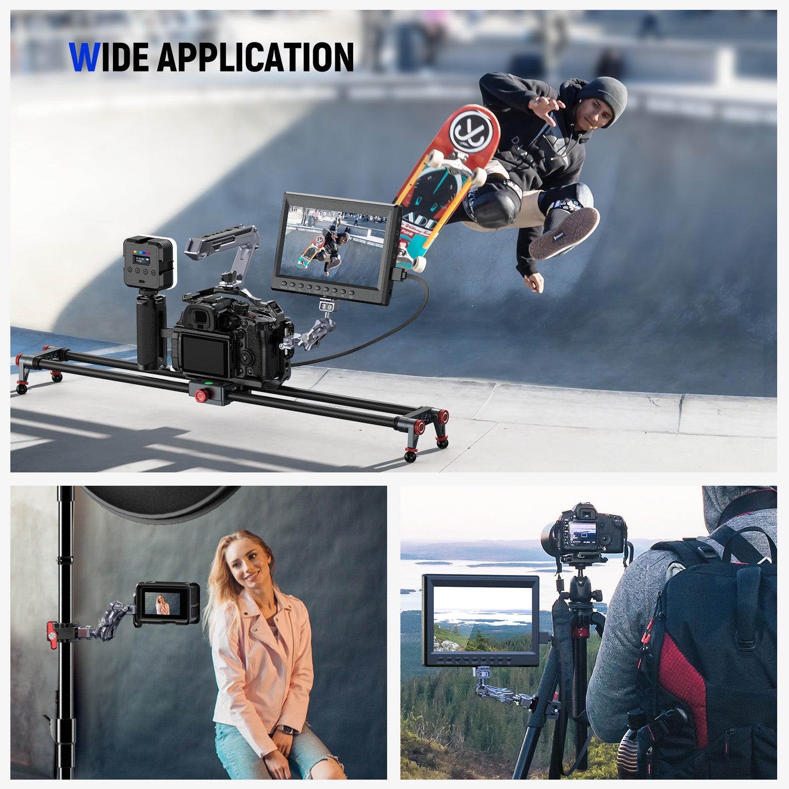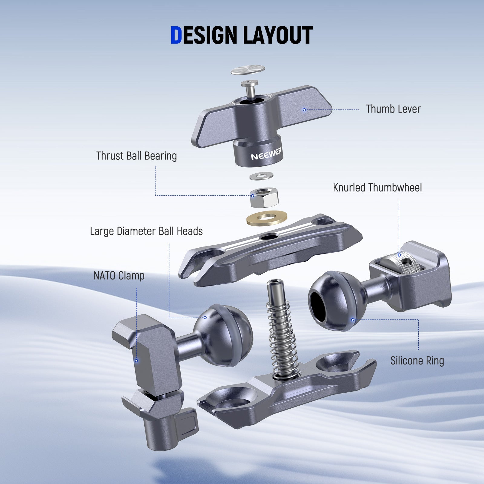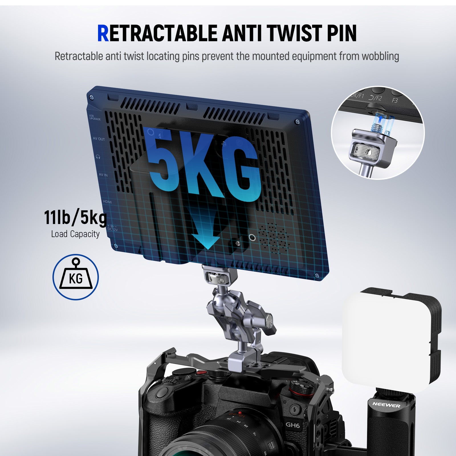 • NATO Clamp & 1/4" Screw- An NATO clamp can quickly connect to a camera cage (compatible with SmallRig and NEEWER) while a 1/4" screw can mount a range of devices up to 11lb/5kg, including field monitors, LED video lights, microphones, and action cameras