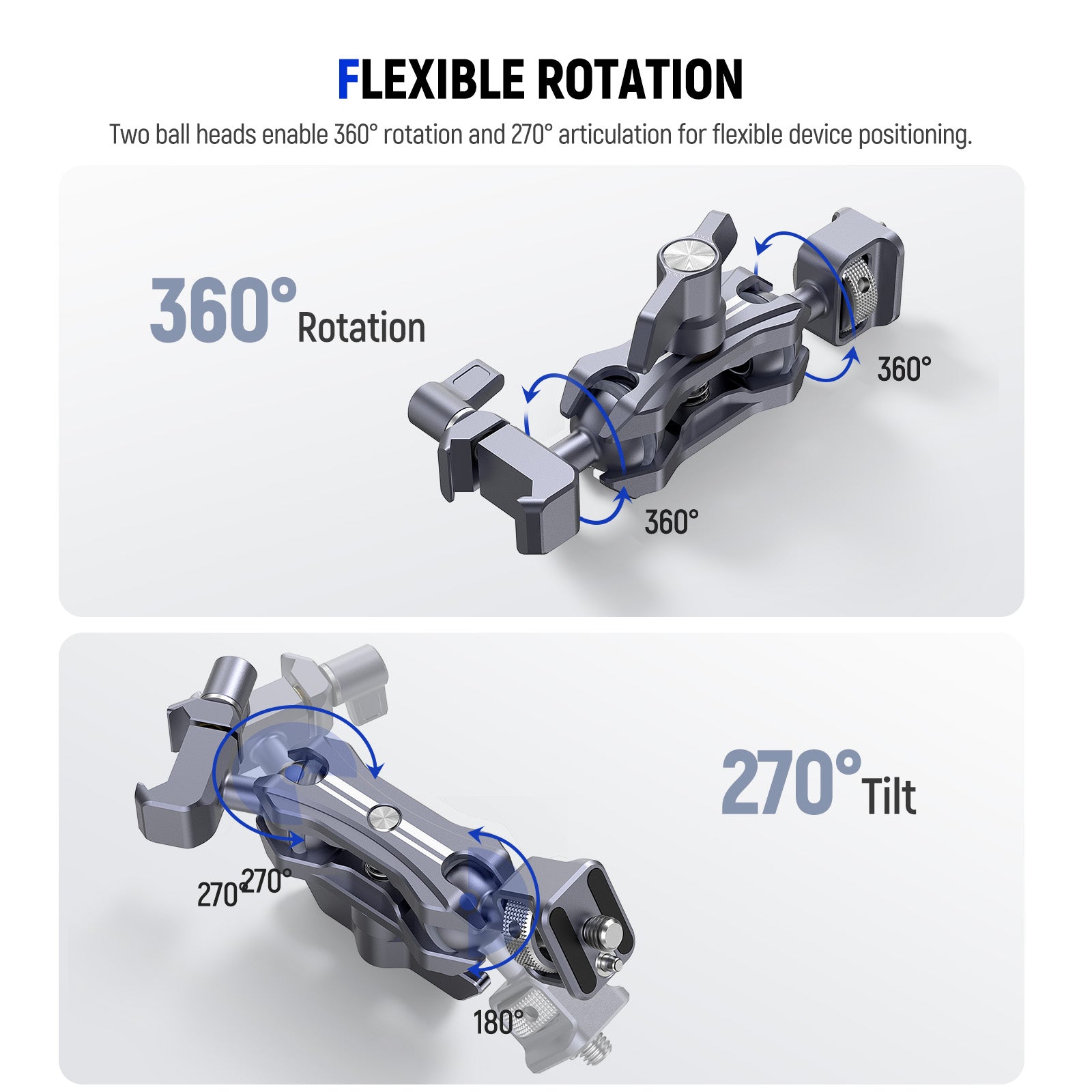 • 360° Rotation & 270° Tilt- This magic arm camera mount with two ball heads enable 360° rotation and 270° tilt for flexible positioning. Rubber rings increase friction for extra security