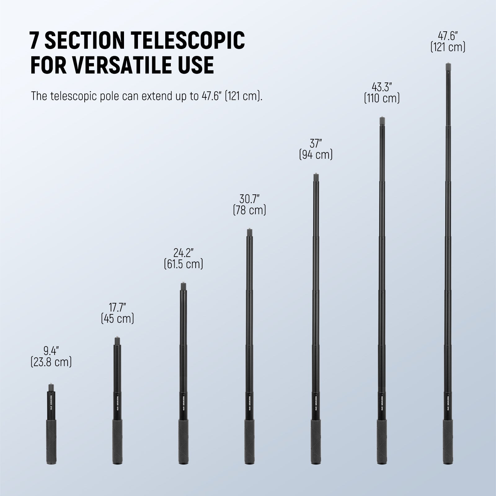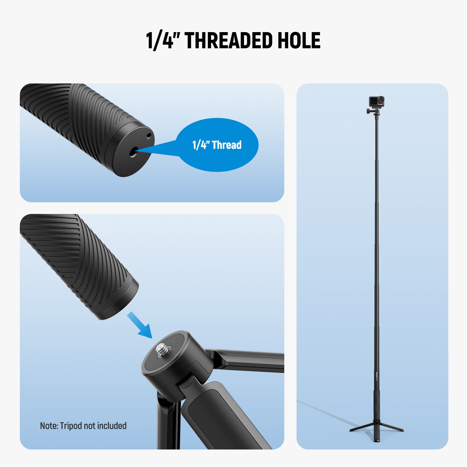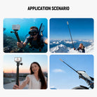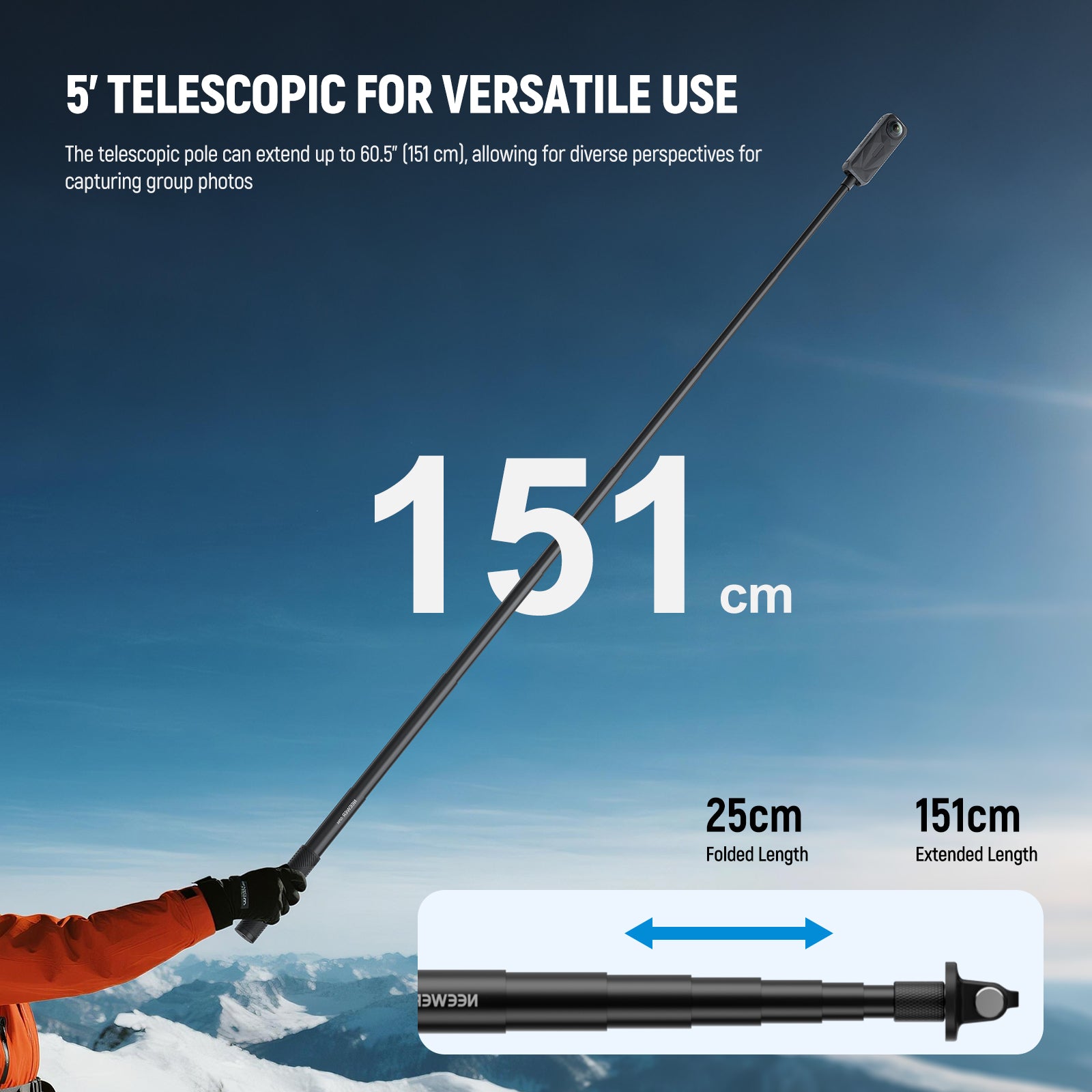 - 5' Telescopic for Versatile Use- The telescopic pole can extend up to 60.5" (151 cm), allowing for diverse perspectives for capturing group photos, landscapes, vlogs, travel videos, or events like weddings and concerts, ideal as content creator essential and influencer must have. When using your action camera in panoramic mode, the rod will not obstruct the view for more immersive and captivating results