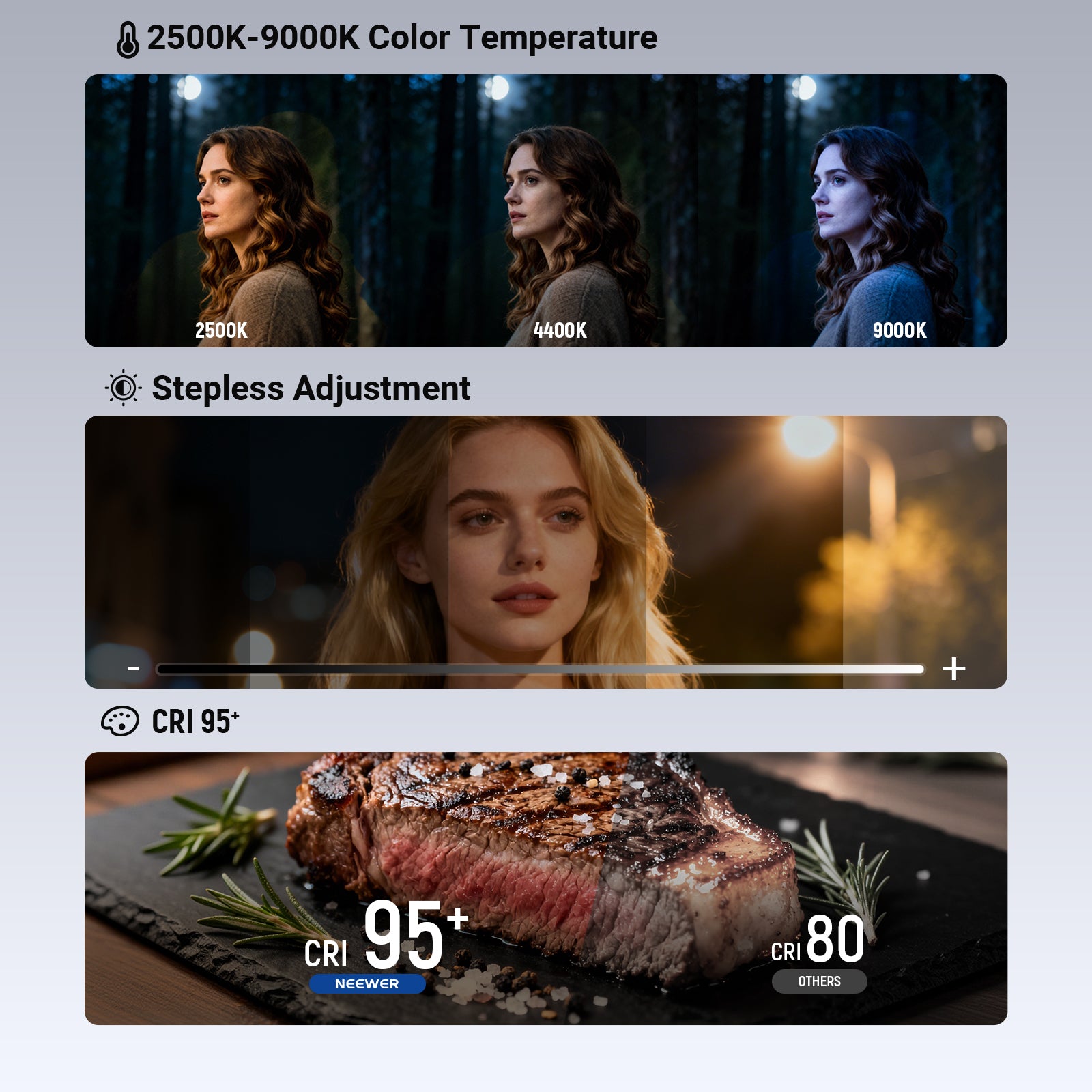 • Small Portable Selfie Panel Light- NEEWER photography lighting gear for phone pictures and films is 3x2.6x0.9in when folded, at 3.95oz. The 45 LEDs deliver soft & bright illumination with high CRI95 to flatter skin and ensure accurate colors for makeup