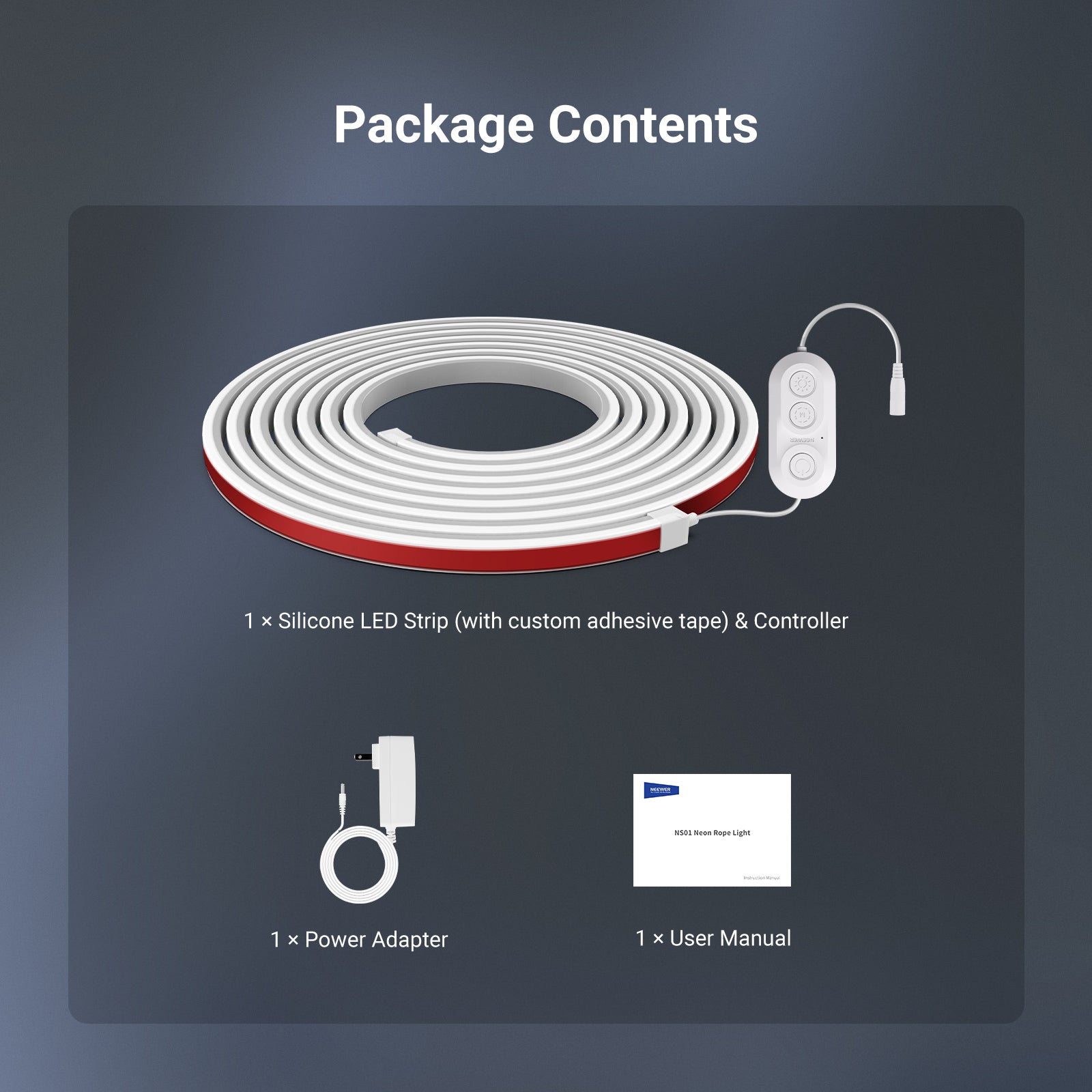 - Bright & Flexible Silicone Strip Light- The NS01 neon LED strip is made of pure waterproof silicone, soft, flexible, and easy to bend, allowing easy installation in bedrooms, corners, eaves, along walls, or inside wardrobes. The front emitting design, with 252 LEDs (84 LEDs/m) embedded in the high transmission silicone strip, delivers bright, natural, and diffused colorful light for a dreamy & inviting home ambiance. Note: The controller and power adapter are NOT waterproof