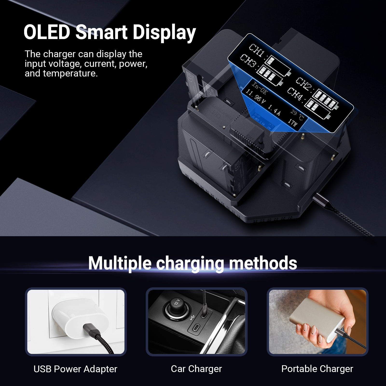 - OLED Smart Display- The main interface displays the real time charging status of each battery once plugged in, including voltage, current, temperature, and power, making the charging process visual. Press the button to switch to the display of the charger's input voltage, current, power, and temperature.