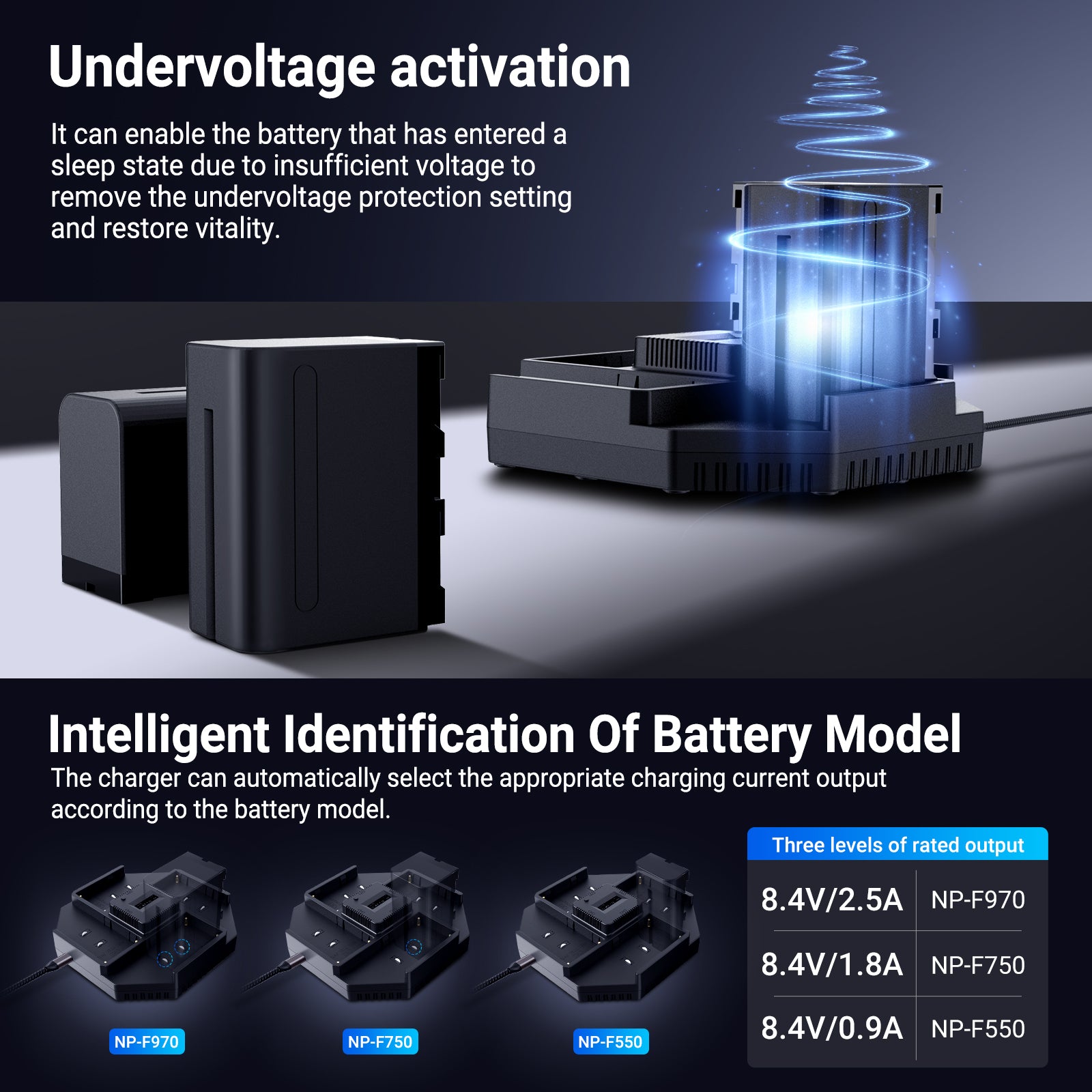 - Fully Compatible with Sony NP-F Series Batteries- The NP-F charger seamlessly accommodates NP-F550, NP-F750, and NP-F970 series batteries, with each channel featuring 3 levels of rated output: 8.4V/0.9A, 8.4V/1.8A, 8.4V/2.5A. With a current detection switch, it automatically switches between the three output levels based on the specific battery model, achieving optimal charging efficiency
