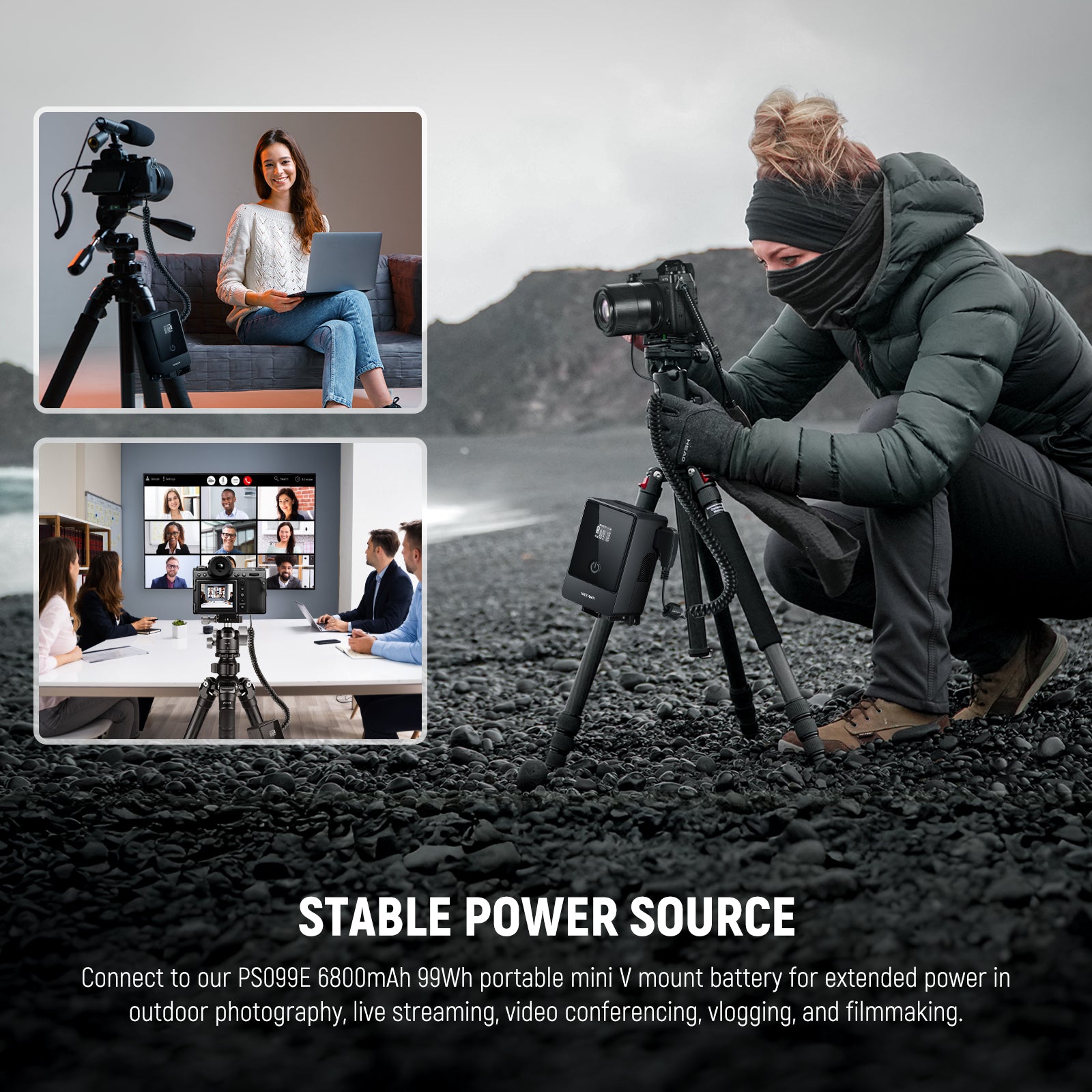- Stable Power for Longer, Safer Footage- Say farewell to cable failures and safeguard your critical footage. Our intelligent chip guarantees a constant and stable power supply for your creation. Connect to our PS099E 6800mAh 99Wh portable mini V mount battery for extended power in outdoor photography, live streaming, video conferencing, vlogging, and filmmaking