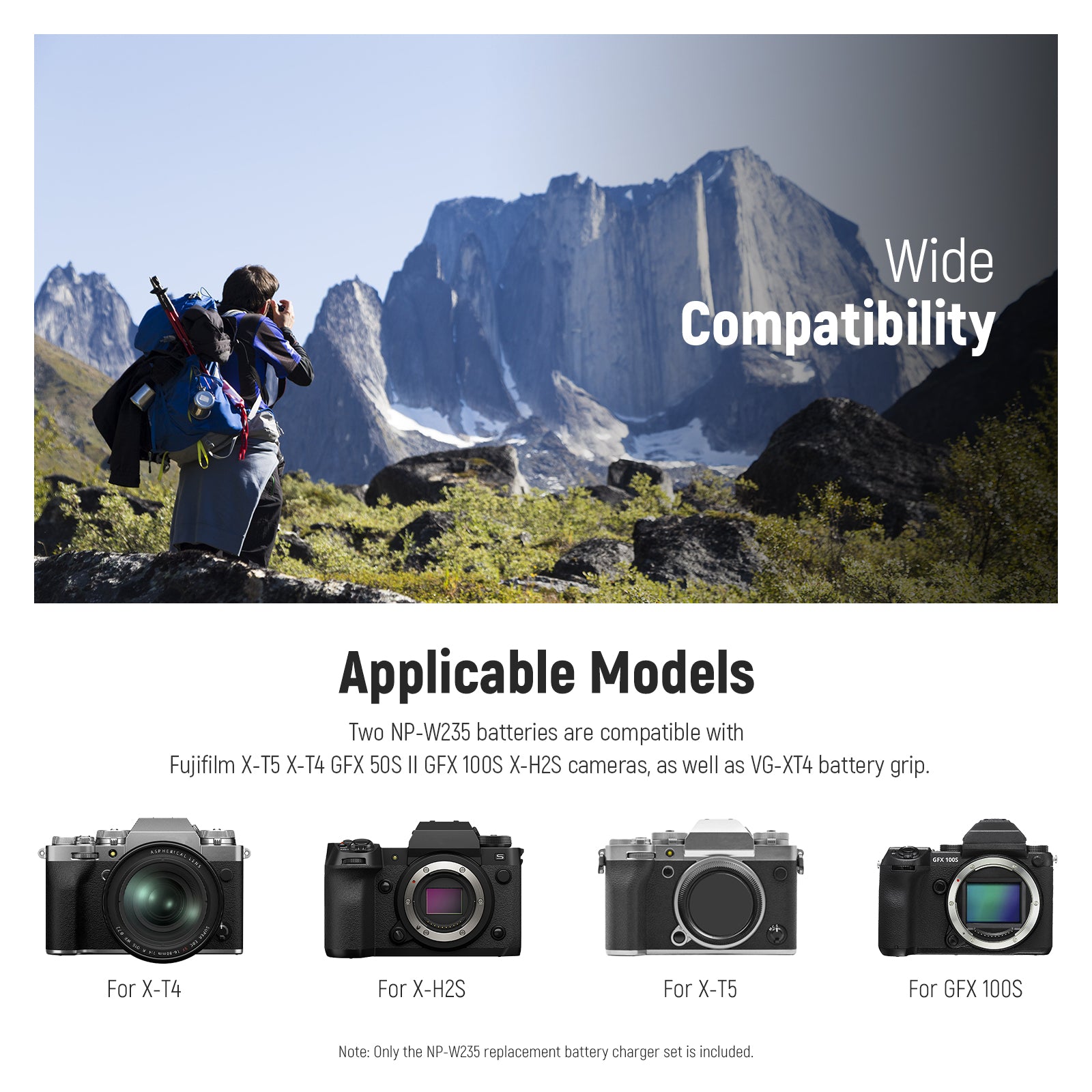 • Fully Compatible with Fujifilm- Equally powerful replacement for original NP-W235 battery, the two rechargeable camera batteries are fully compatible with Fujifilm?X-T5 X-T4 GFX 50S II GFX 100S X-H2S cameras, as well as VG-XT4 battery grip