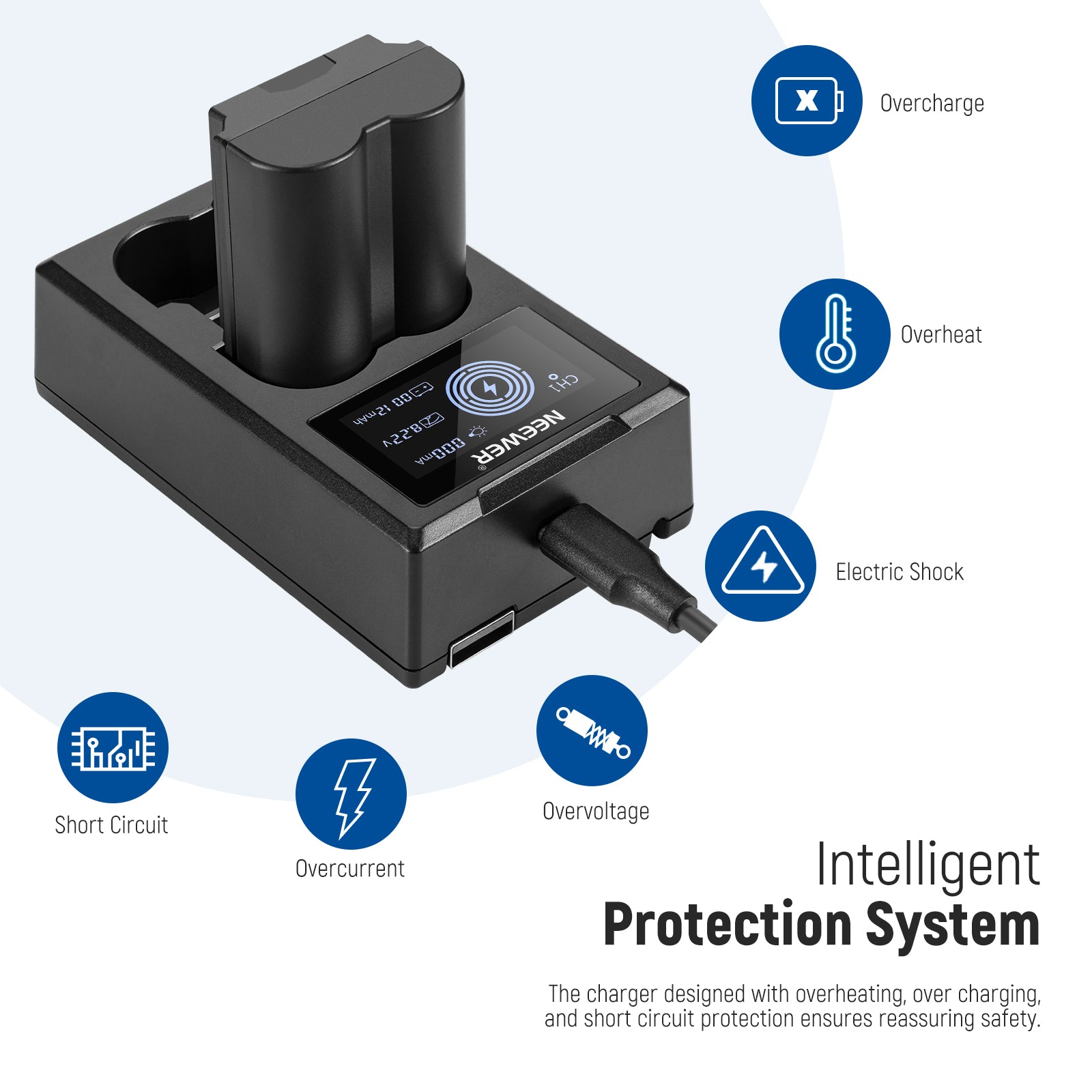 • Easy to Read LCD Display- The charges includes a LCD display to clearly show the real time charging progress, charging voltage, and other information for the two charger slots. With 5V/2.1A charging input, the charger effectively protects the batteries from overcharging, over heating, over current, over voltage, short circuit, and electronic shock