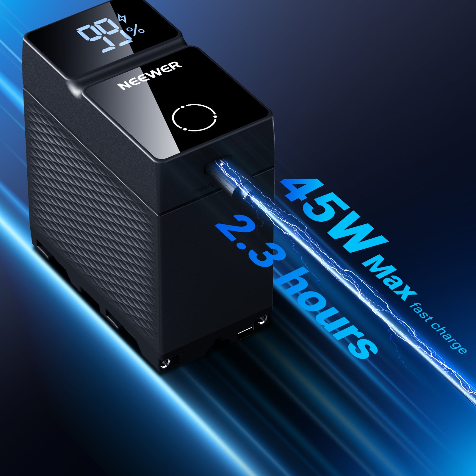 - Dual Port NP-F Battery with 45W PD Fast Charging- Featuring a USB A output (up to 24W) and a bidirectional USB C port (up to 45W), this f970 battery delivers up to 55W when both ports are used together, ideal for powering a camera, monitor, or other gear simultaneously. The USB C port supports bidirectional 45W PD fast charging, enabling rapid device charging and a full battery recharge in just 2.3 hours