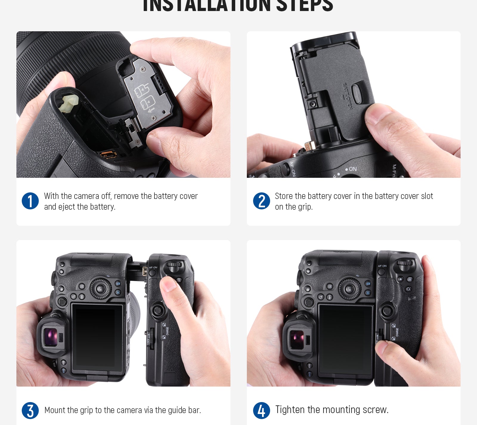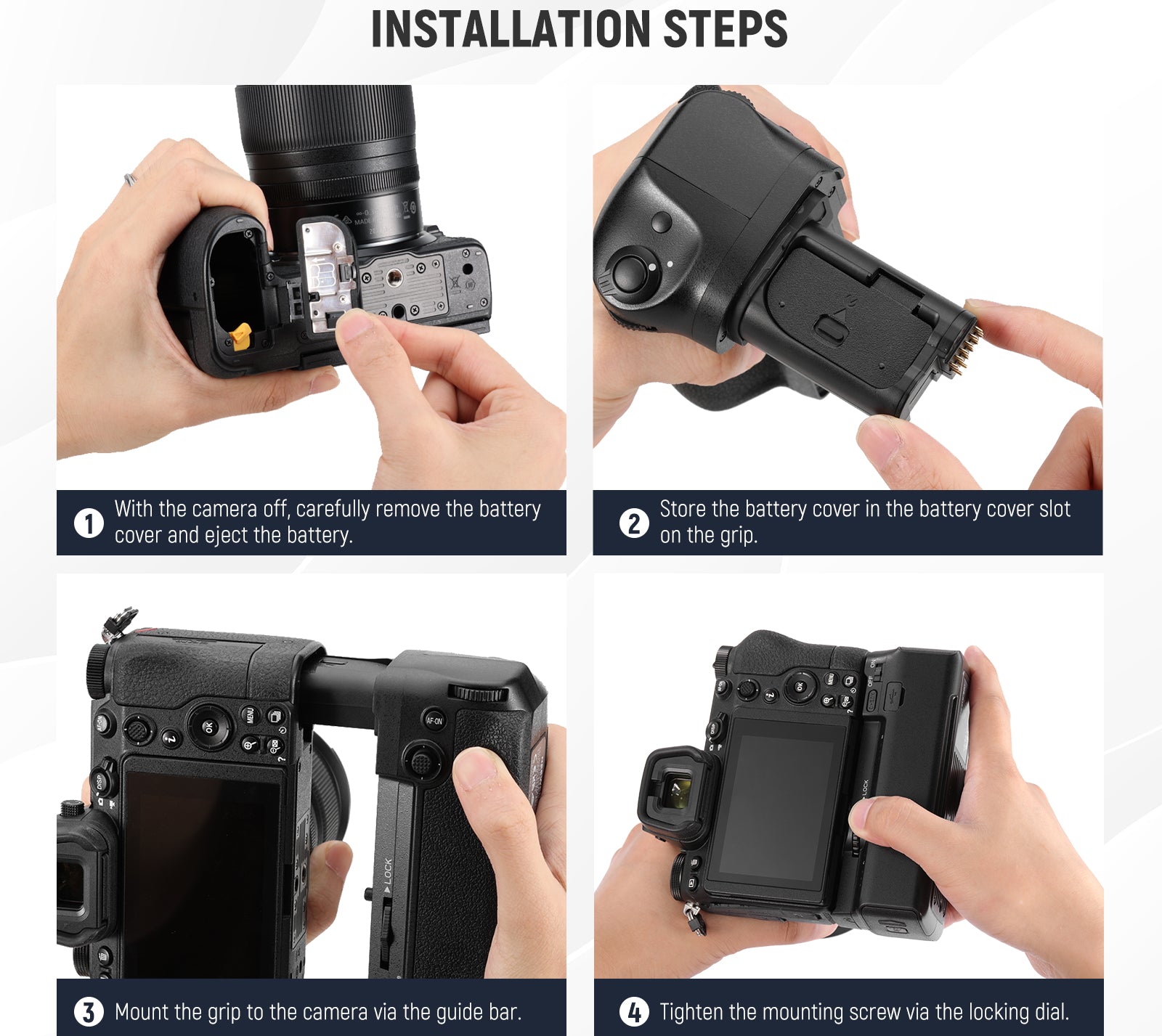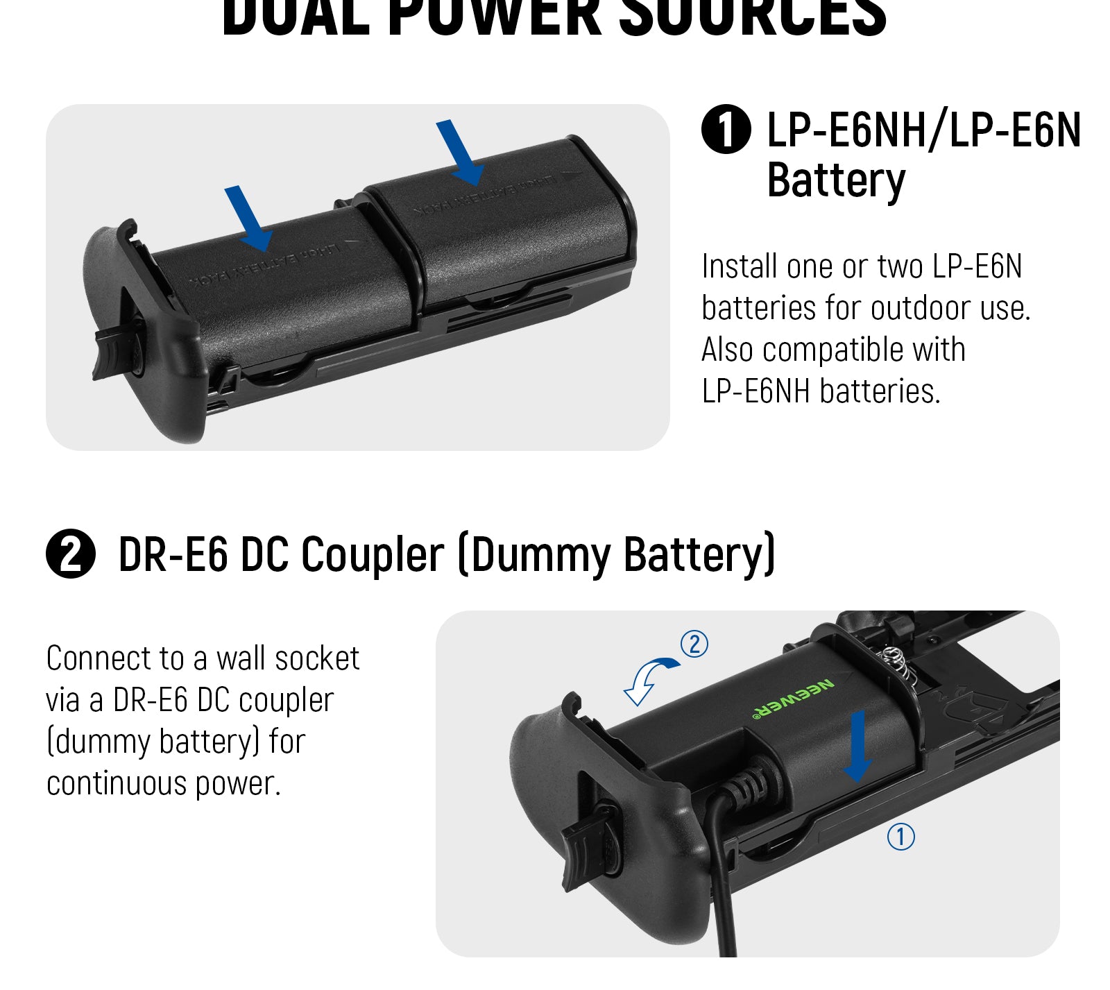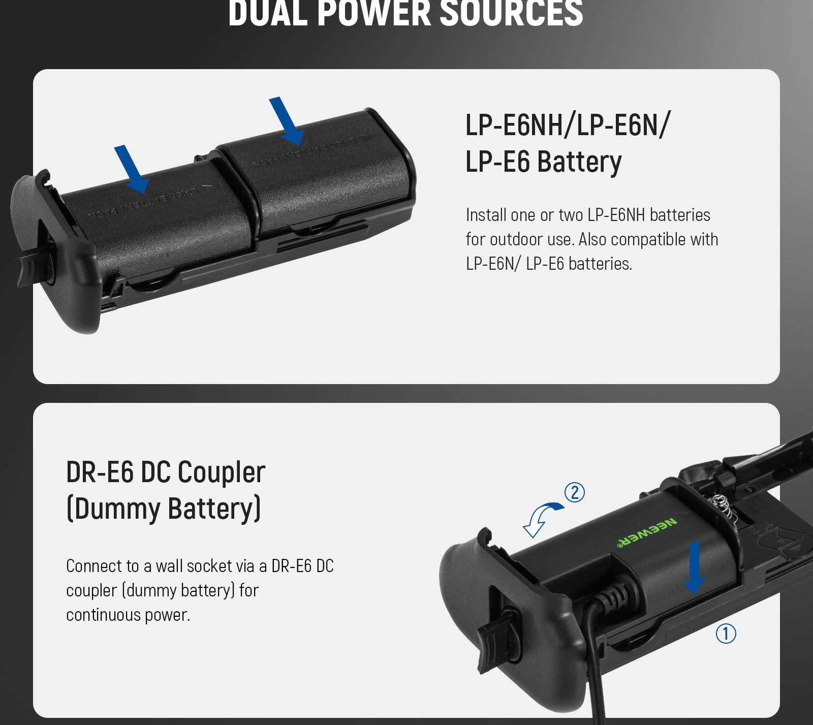 NEEWER offers camera battery grips compatible with Canon, Sony, and Nikon cameras. These battery grips are designed for shooting stable vertical pictures and providing more battery power. They can offer a comfortable and firm grip for taking clear and sharp images in vertical orientations. Choose a good photo grip that is compatible with your camera model.