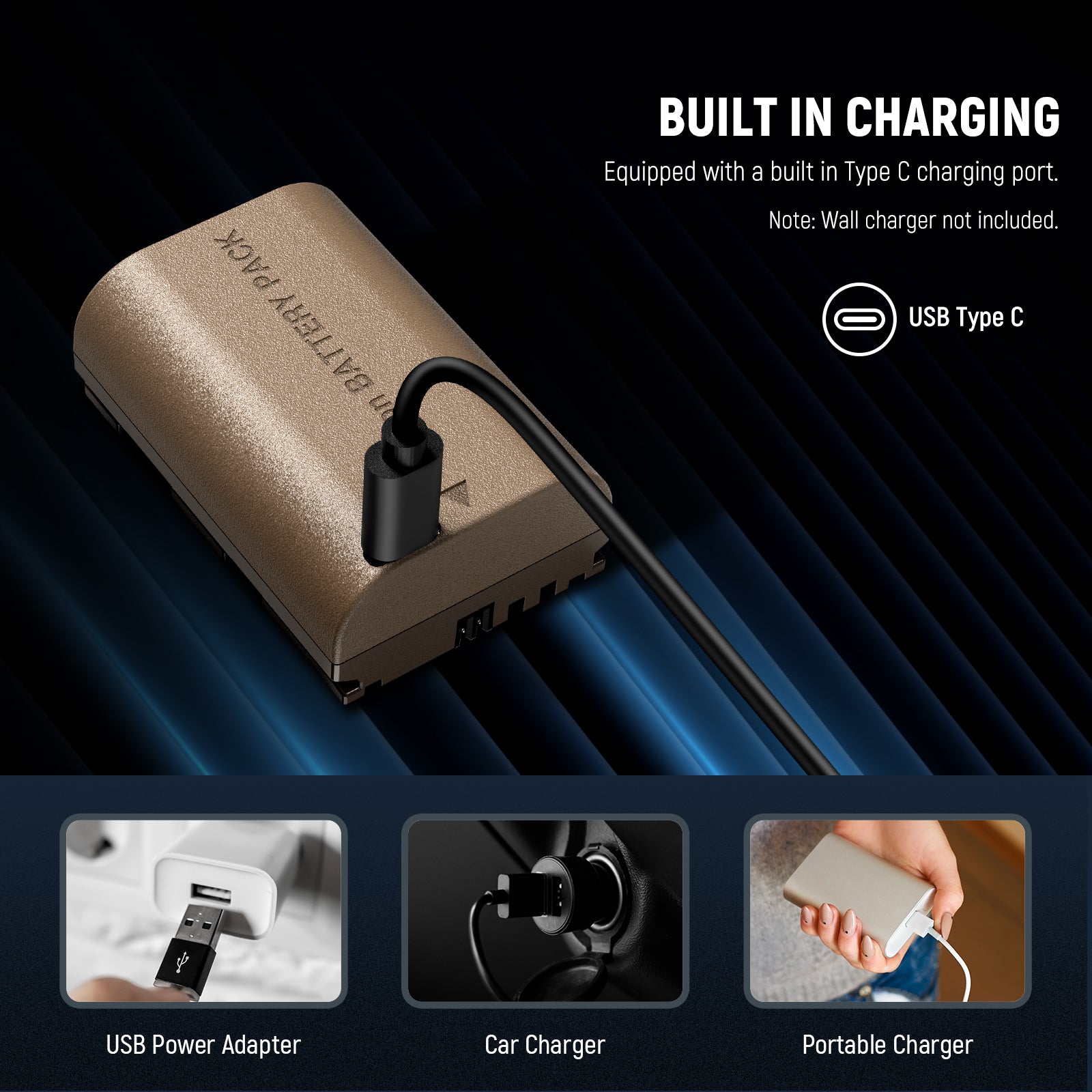 - 3.3H Fully Recharged via Type C- An integrated type C port allows effortless power supply via a portable charger, laptop, adapter, or car charger using the included charging cable. A full charge only takes 3.3H, and an indicator presents the charging status. Efficient to recharge, ensuring a reliable backup for your creative work on the go. Plus, it also supports in camera charging or with an LP-E6P charger (sold separately)
