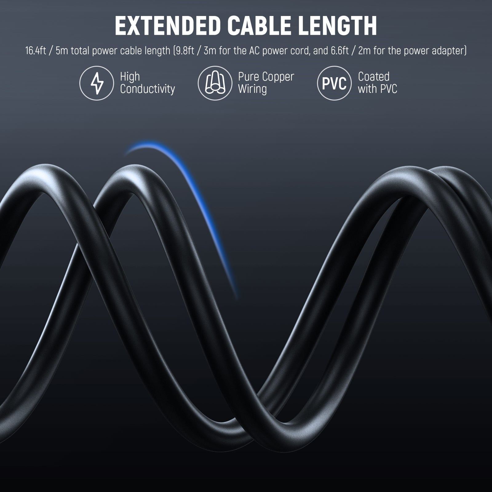 - Extended Power Cables- Cables are made of pure copper for high electrical conductivity and coated with PVC to withstand frequent bending and coiling. With 16.4ft/5m in length (9.8ft/3m long for the AC power cord, and 6.6ft/2m for the output cable of the power adapter), the cables allow you to move and position your flash unimpededly