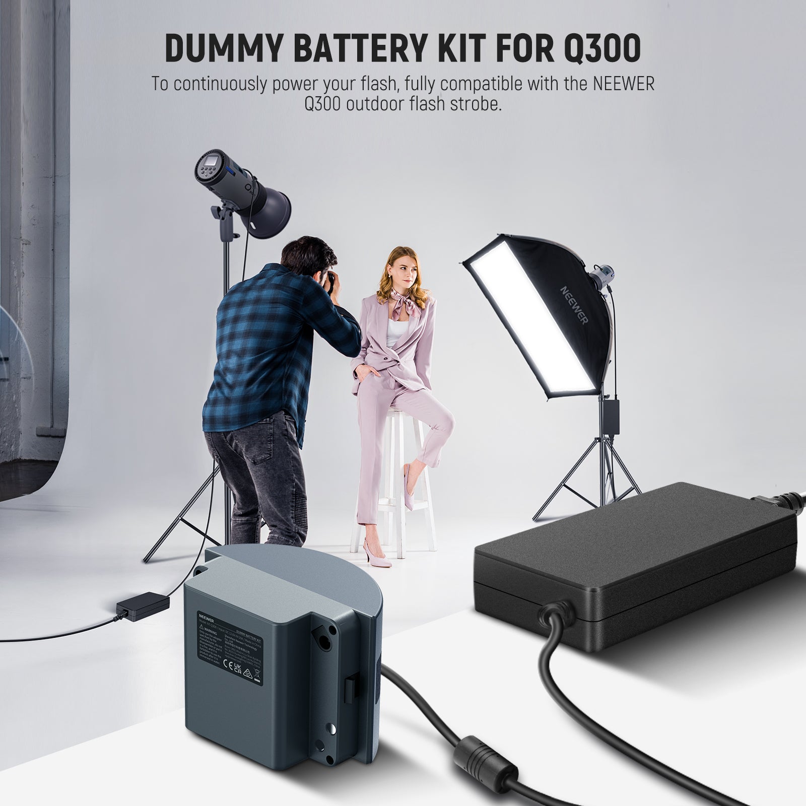 - Dummy Battery Kit for Q300- Fully compatible with NEEWER Q300 outdoor strobe flash, this NT-Q300 dummy battery kit continuously powers your flash, avoids the frequent battery replacement of the standard Q300 lithium battery via the included AC power adapter and cable, and is ideal for studio and indoor photography, vlogging, live streaming, and filmmaking