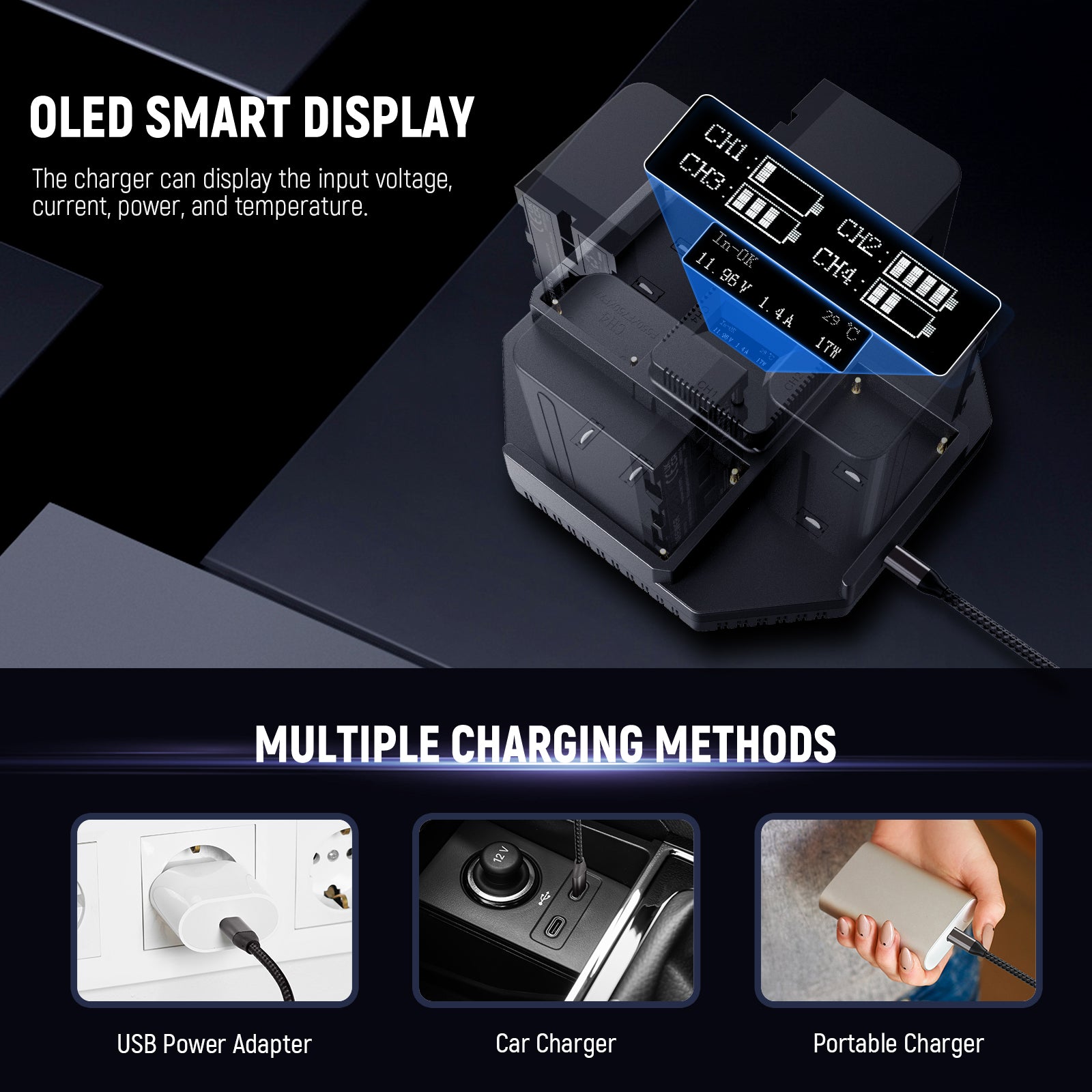 - Comprehensive Protection Designs- Each slot of the NPF battery charger is engineered with precision to ensure a tight fit with the charged battery, featuring a built in advanced circuit with overcurrent protection, securing safe charging. All sides are equipped with precise ventilation holes to prevent overheating during charging, and an incorporated fan will automatically turn on when the charging temperature exceeds 122℉/50℃
