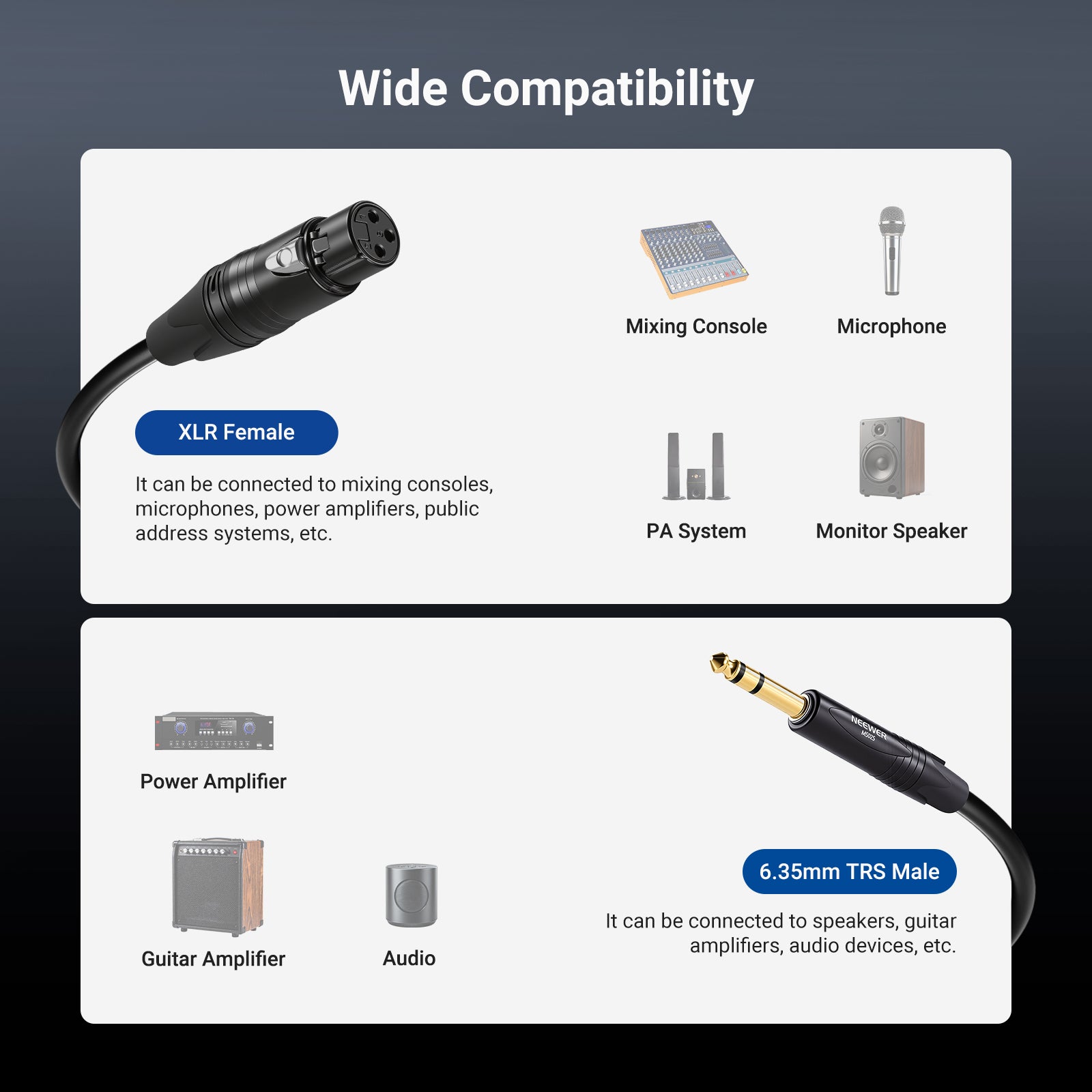 - 1/4 Inch to XLR Female Cable- Connect devices with a 6.35mm TRS input to shotgun/condenser microphones, speakers, mixers, PA (public address) system for studio recording, podcasting, or live performance