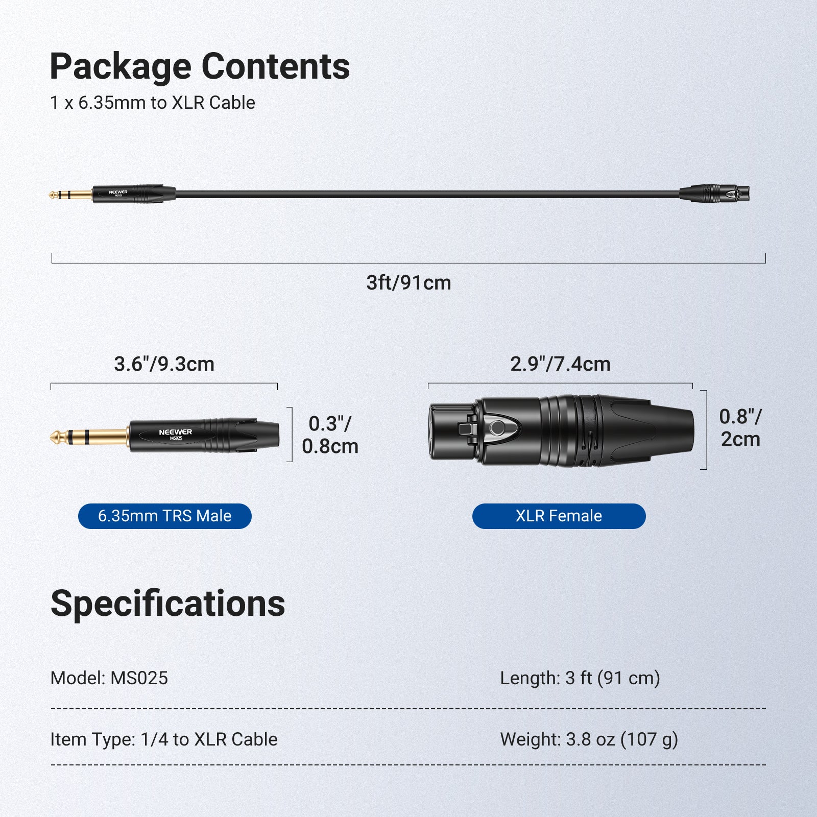 NEEWER MS025 6.35mm 1/4 Inch TRS to XLR Female Cable