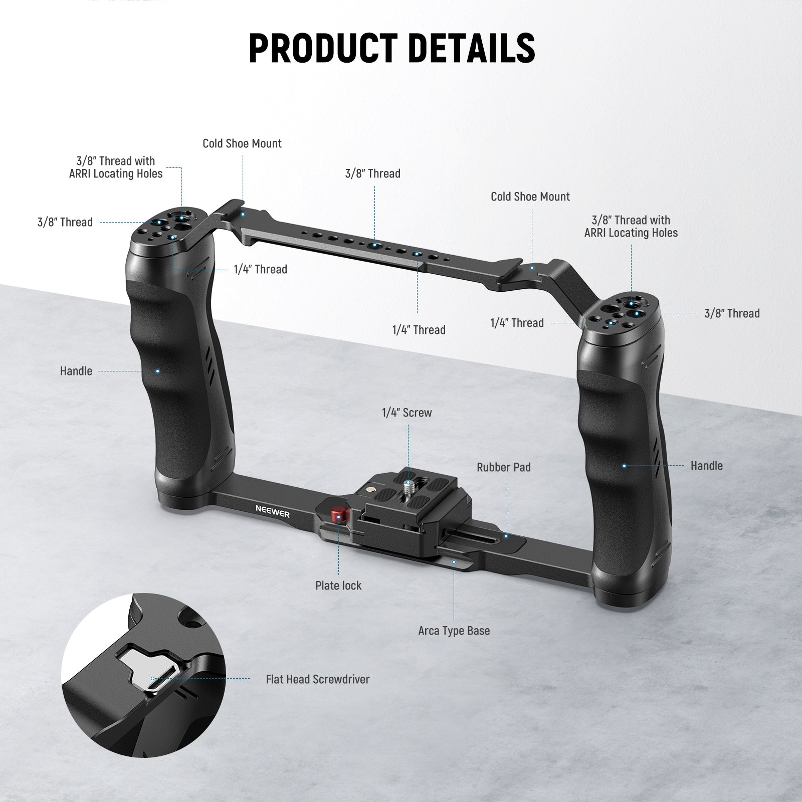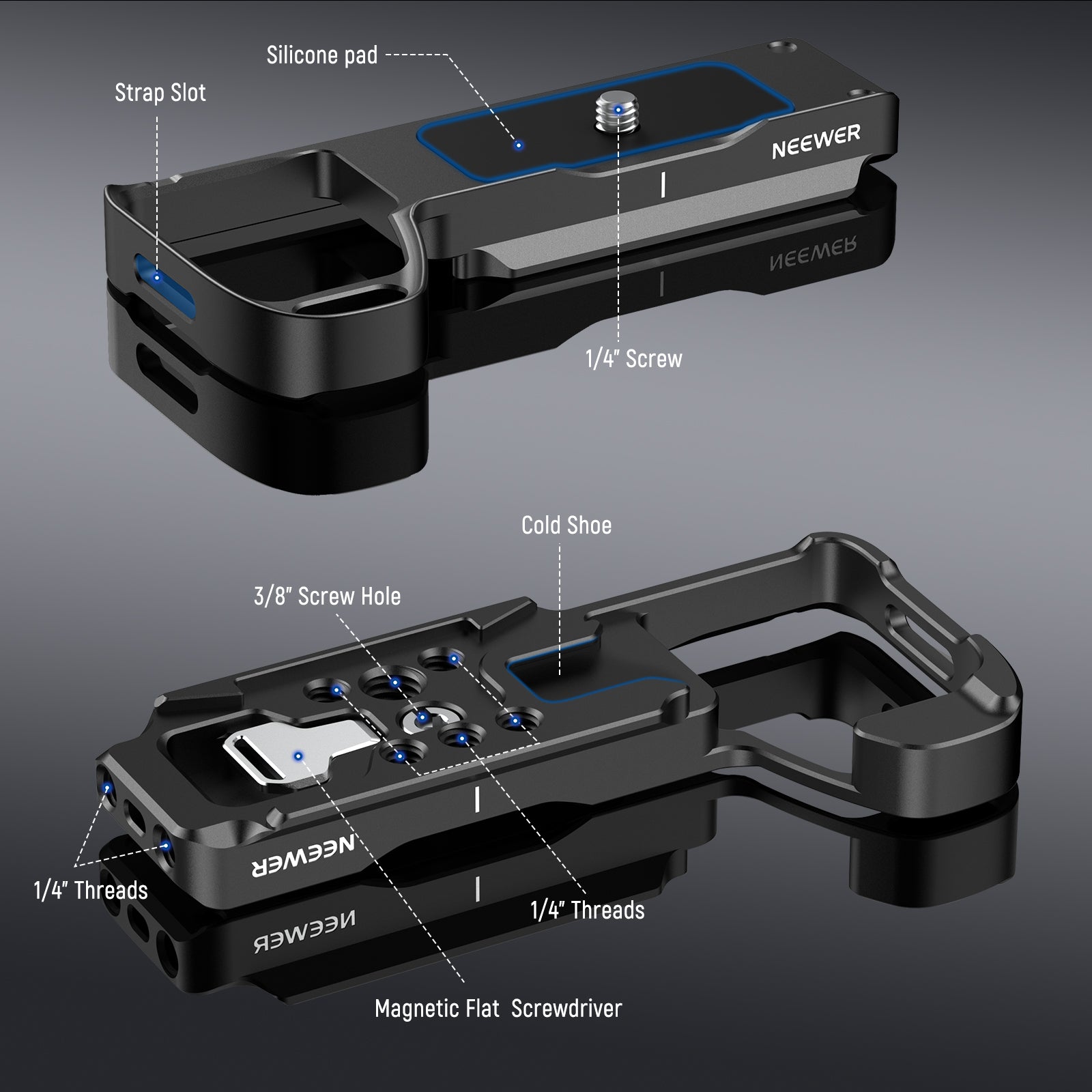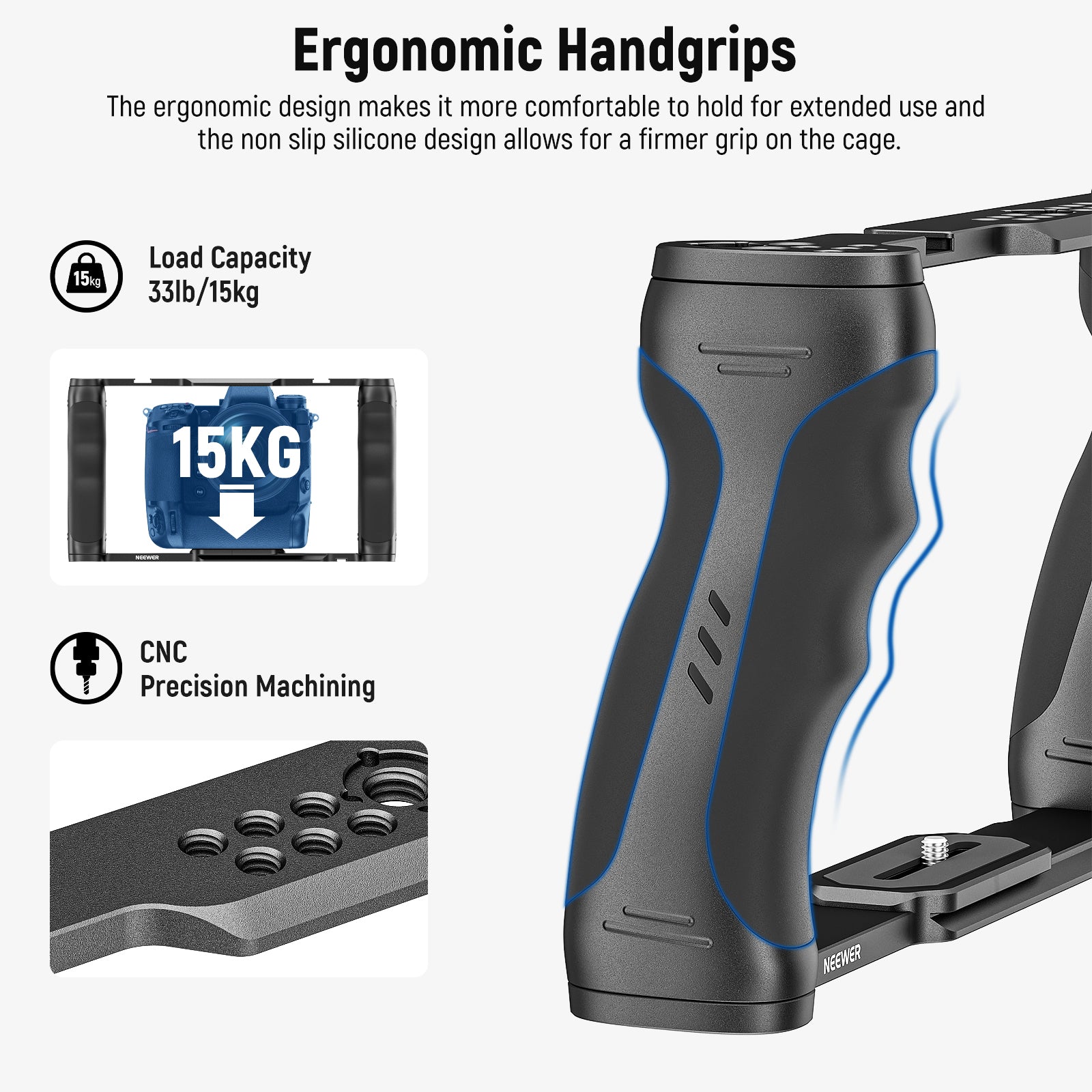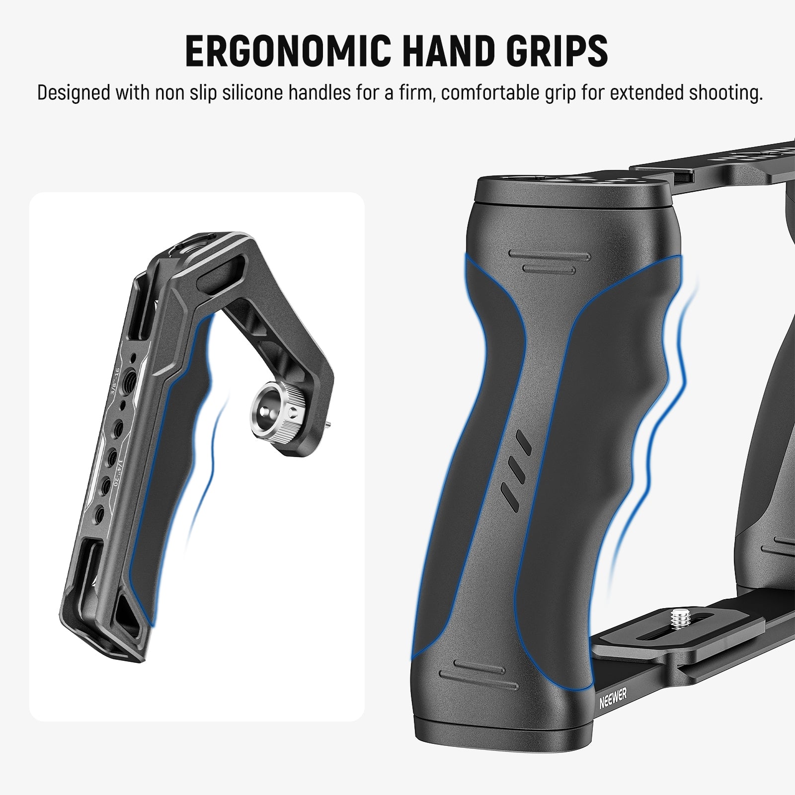 NEEWER offers camera cages, which provide thorough protection and effortless handheld shooting experiences. In addition, our collection includes camera grips and camera baseplates. These camera cages and grips can keep all buttons fully accessible. They are lightweight yet reliable protection. Choose a professional and suitable camera cage, grip, or baseplate.