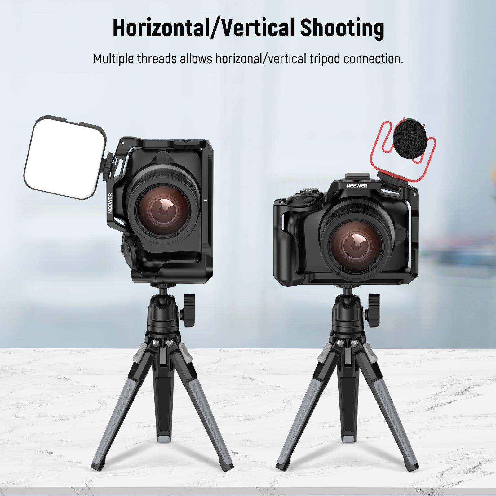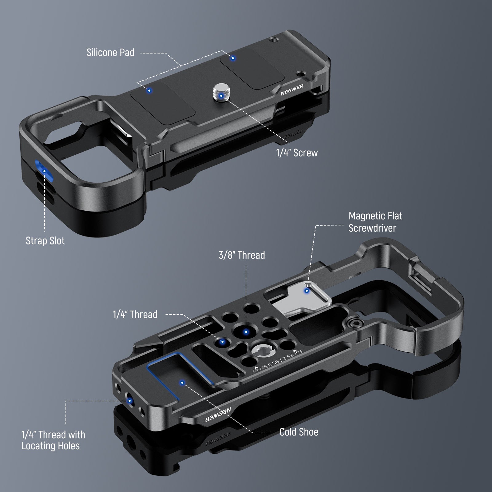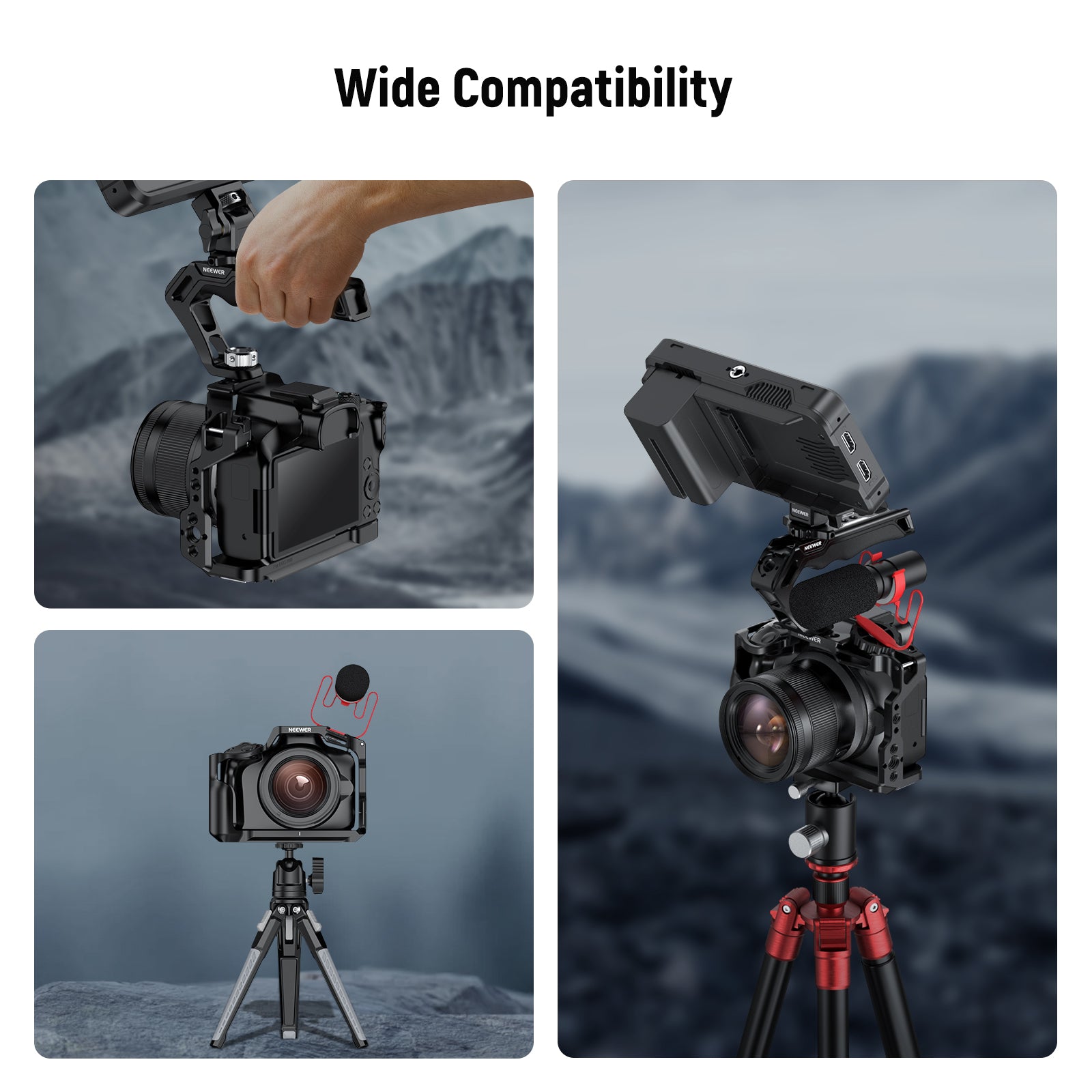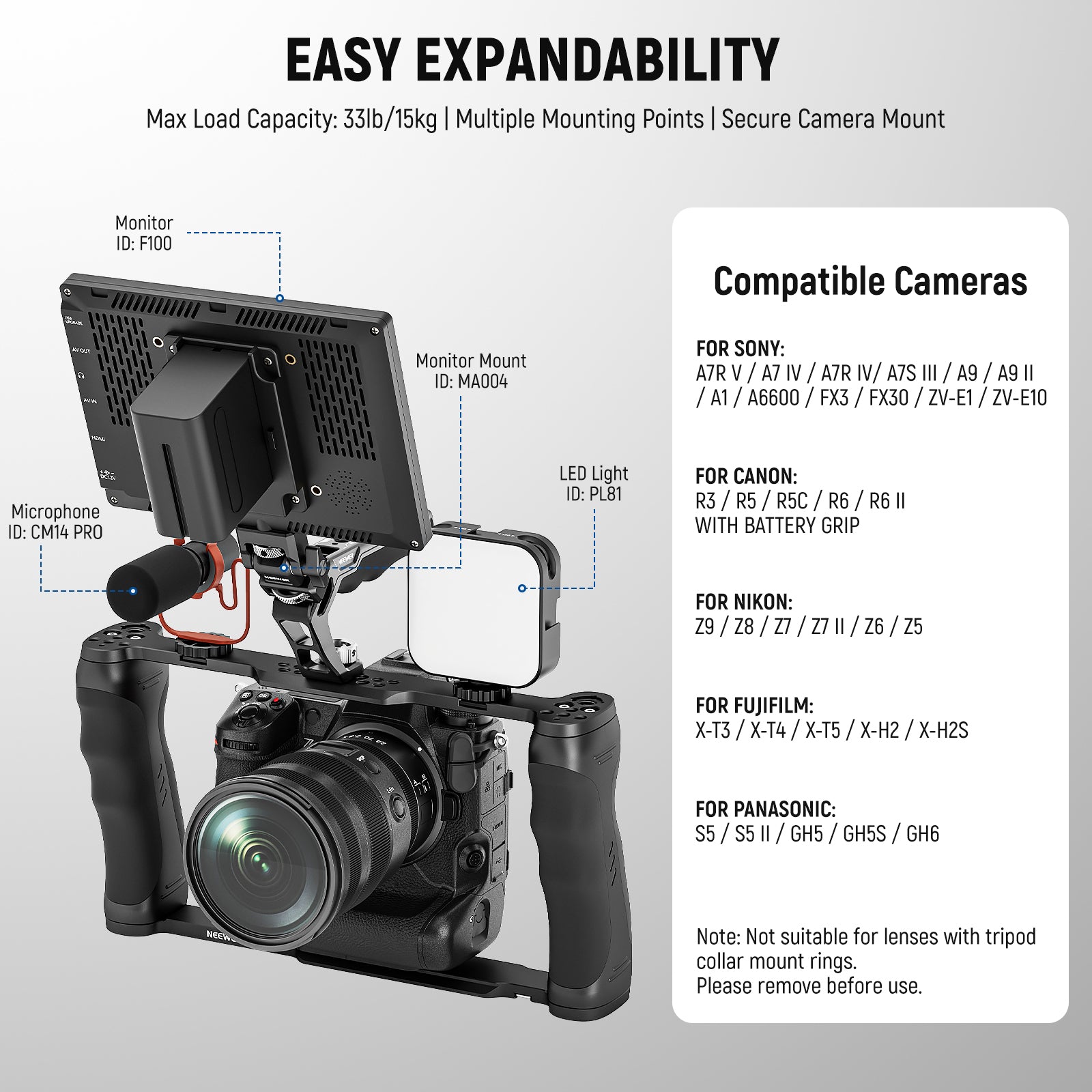 NEEWER offers camera cages, which provide thorough protection and effortless handheld shooting experiences. In addition, our collection includes camera grips and camera baseplates. These camera cages and grips can keep all buttons fully accessible. They are lightweight yet reliable protection. Choose a professional and suitable camera cage, grip, or baseplate.
