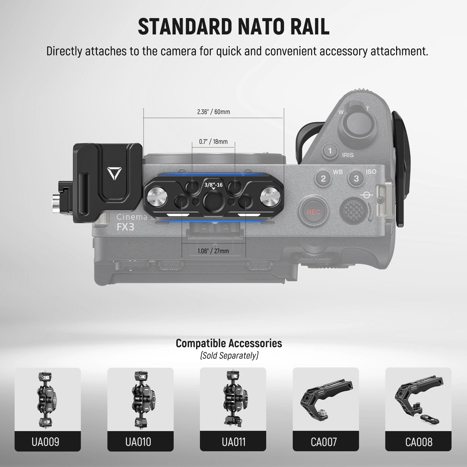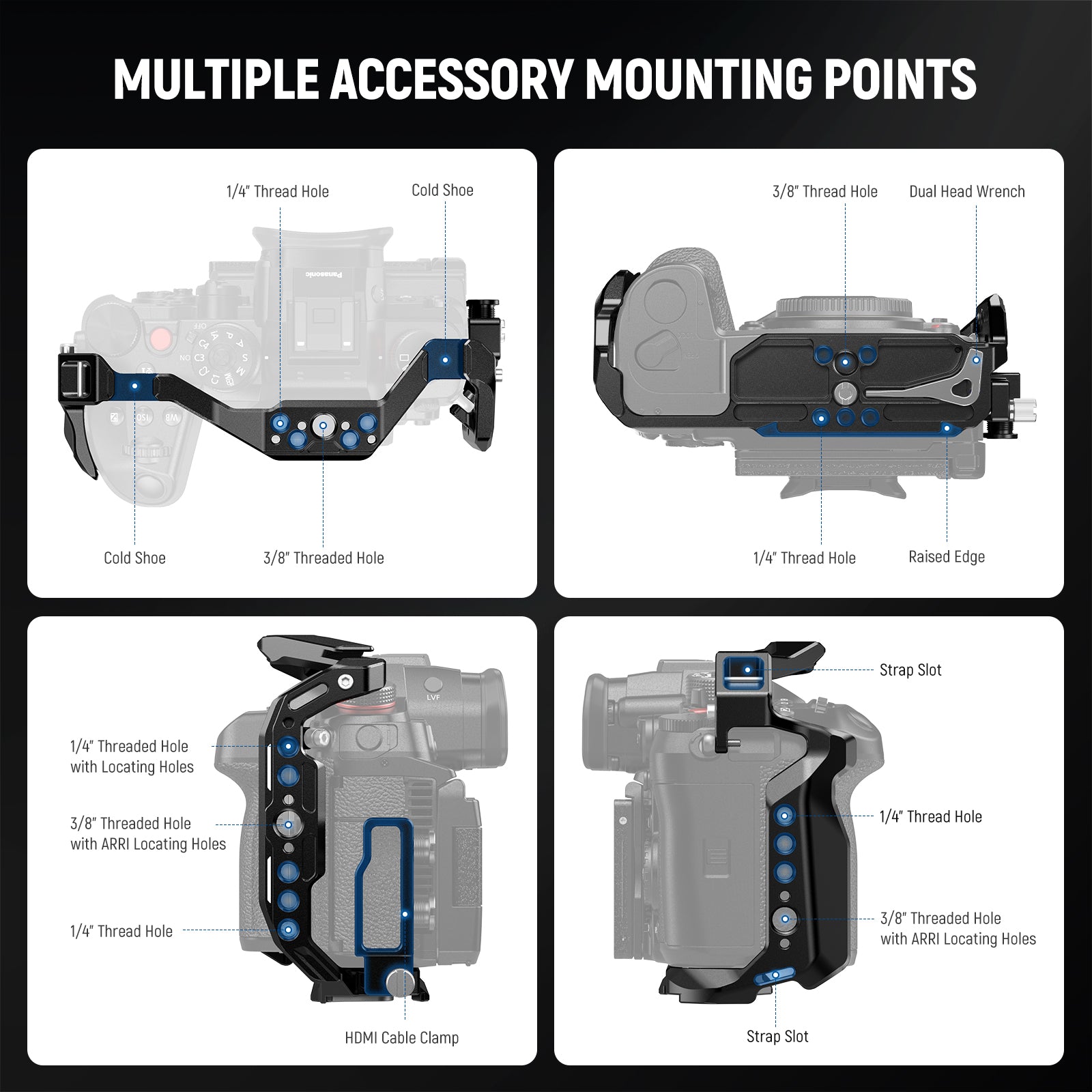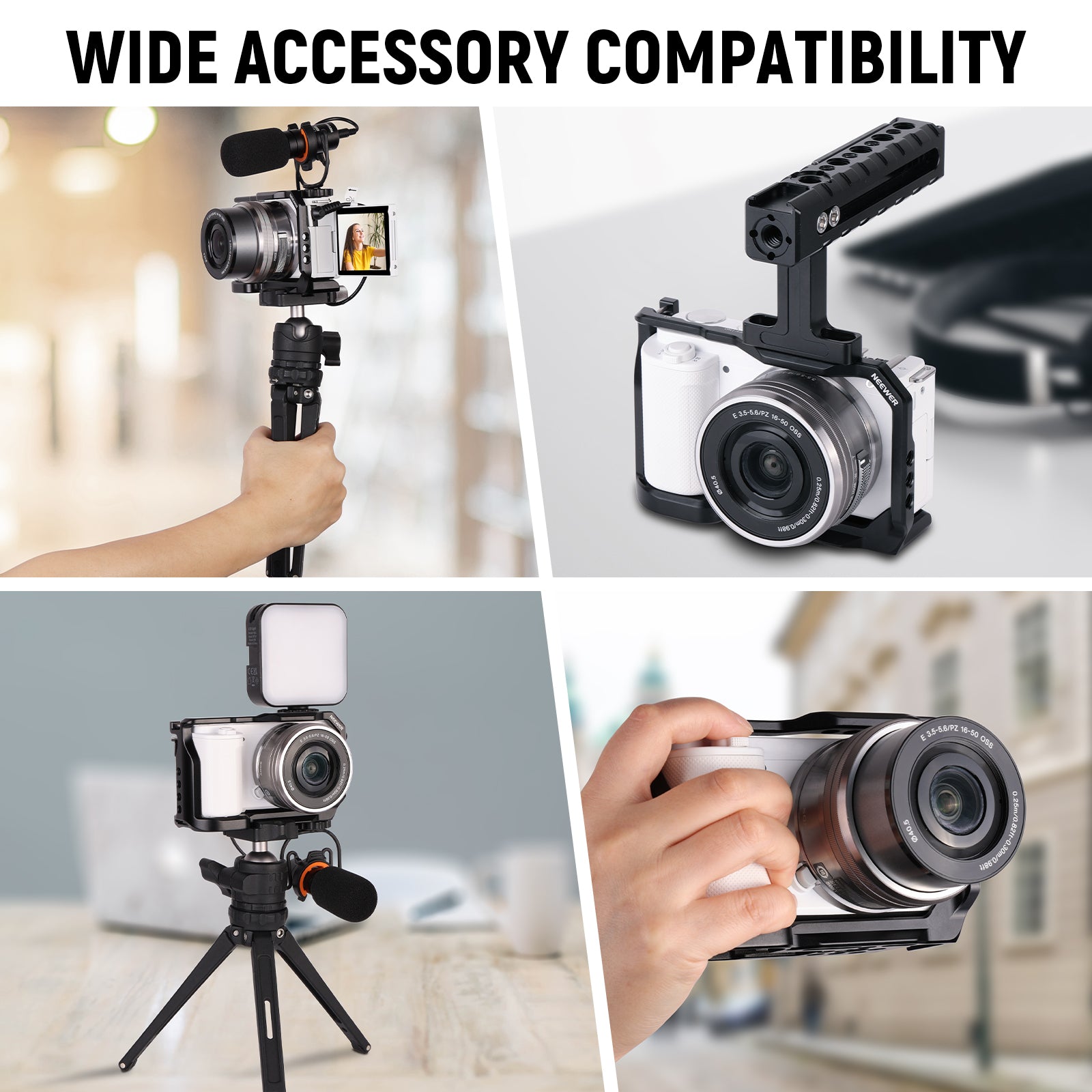 Photographers and videographers commonly rely on camera cages to secure gear such as microphones, external monitors, lights, top handles, follow focus systems, or battery packs. Most cages offer multiple 1/4"-20 and 3/8"-16 threaded holes, cold shoe mounts, and NATO rails for maximum flexibility and setups - especially essential in professional video production, where compact handheld or shoulder-mounted rigs must be adjusted quickly to create seamless productions.