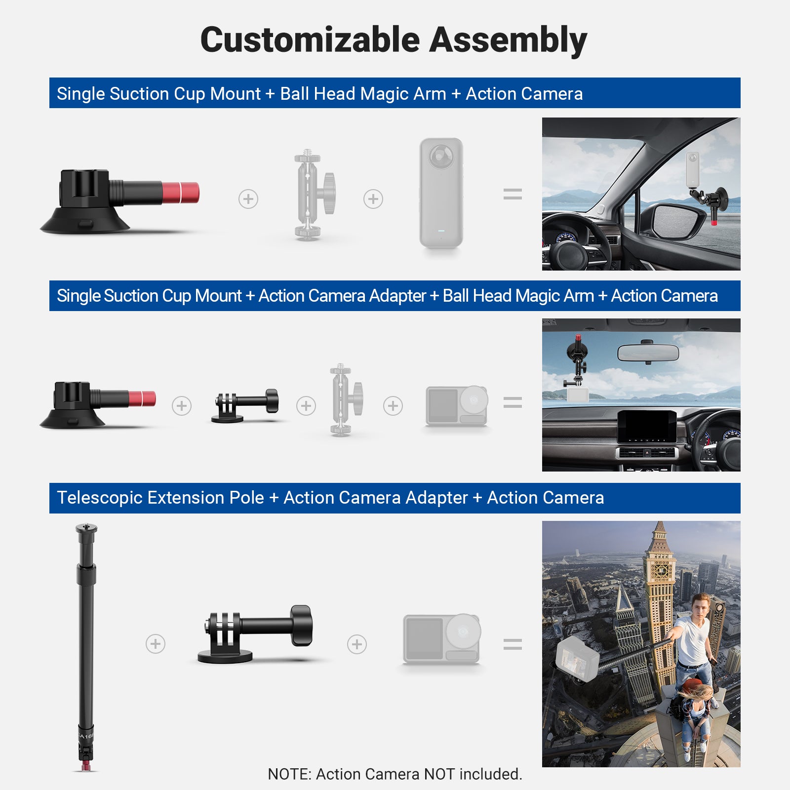 - Triple Suction Cup Car Mount Kit- The triple suction cup camera mount for car forms a stable triangle via NATO rails and clamps, ensuring quick, easy assembly, and reliable supports your action camera for POV shots on the road