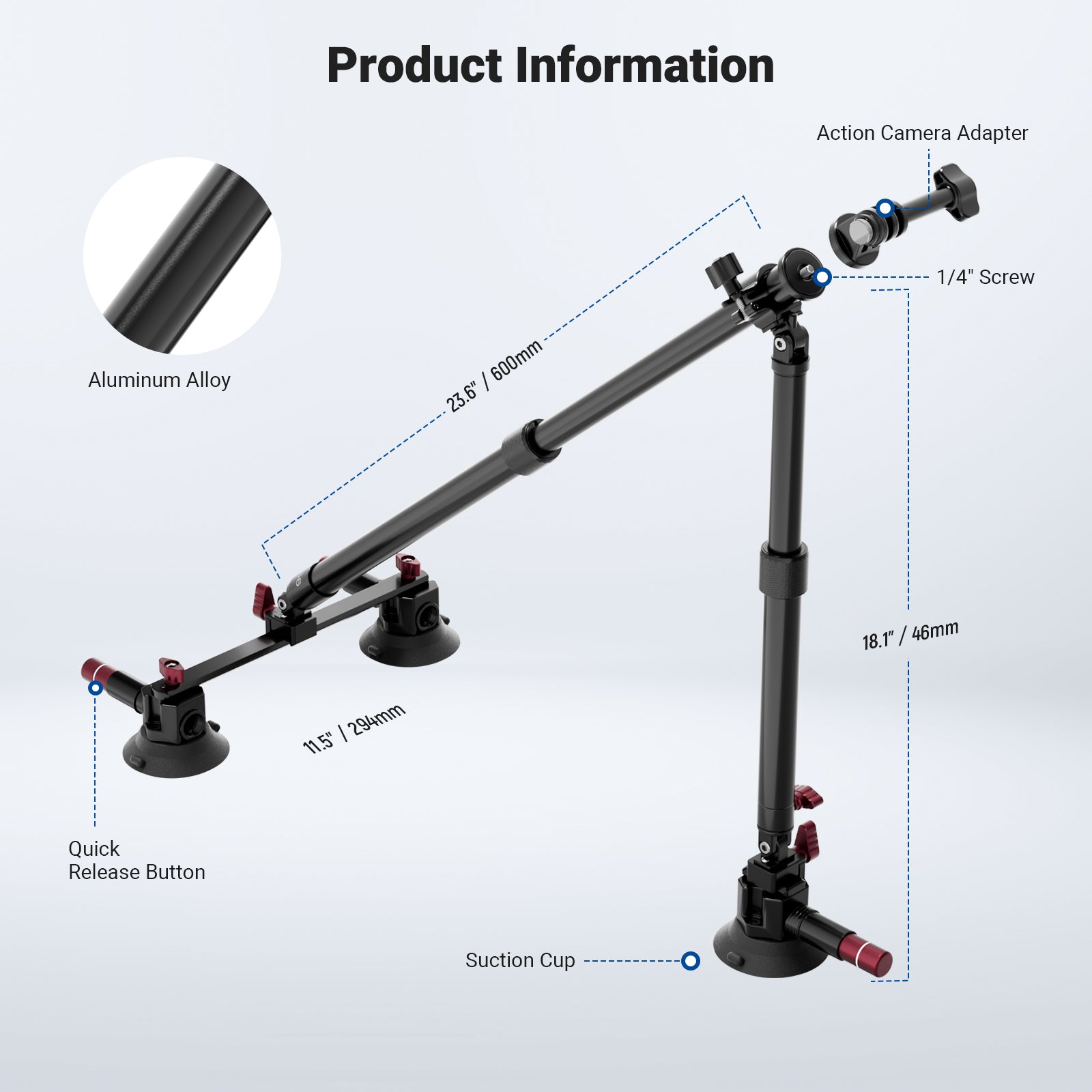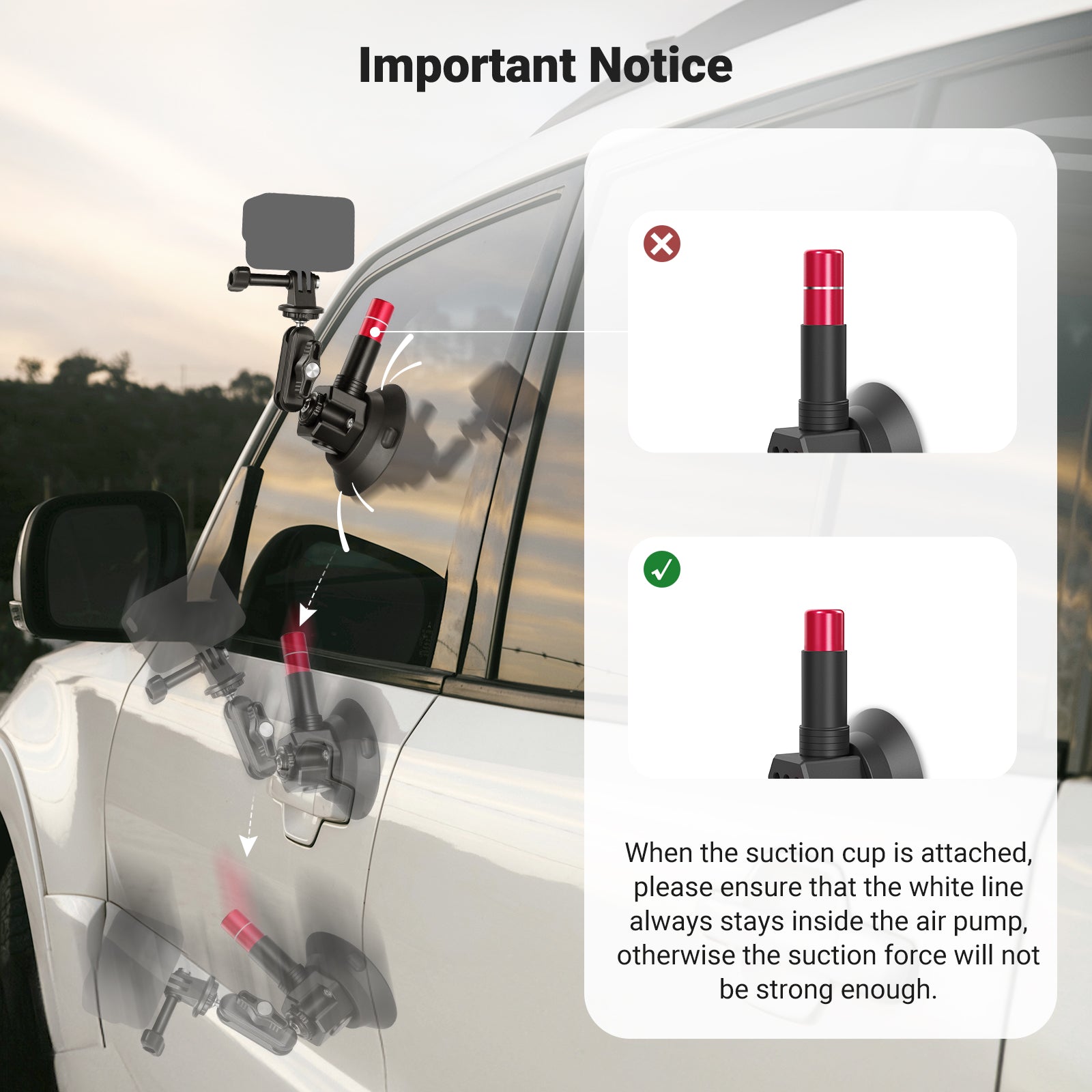 - Reliable Vacuum Suction Strength- The action camera holder for video recording features three 3"/74 mm suction cups for a firm hold on hoods, windshields, or roofs. A white marker shows secure suction when hidden and loose when visible