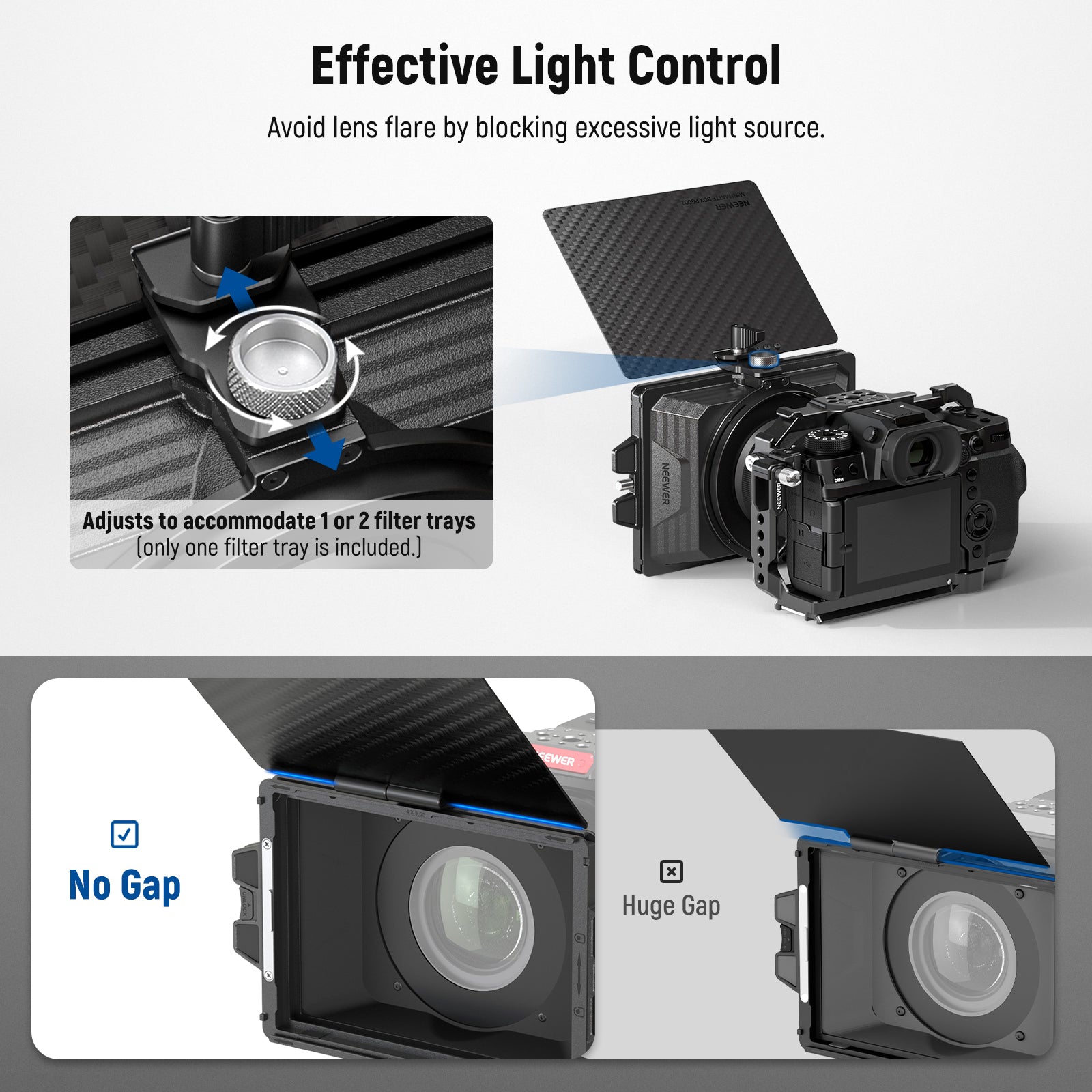 - 4" x 5.65" Standard Filter Tray- The included one filter tray fits 4"x5.65" rectangular filters (not included). Filters (sold separately) can be secured by the filter tray screw knobs and protected by rubber pads. Compatible with K&F Compatible with NISI Compatible withTIFFEN Compatible with Tilta Compatible with SmallRig square filters for filming