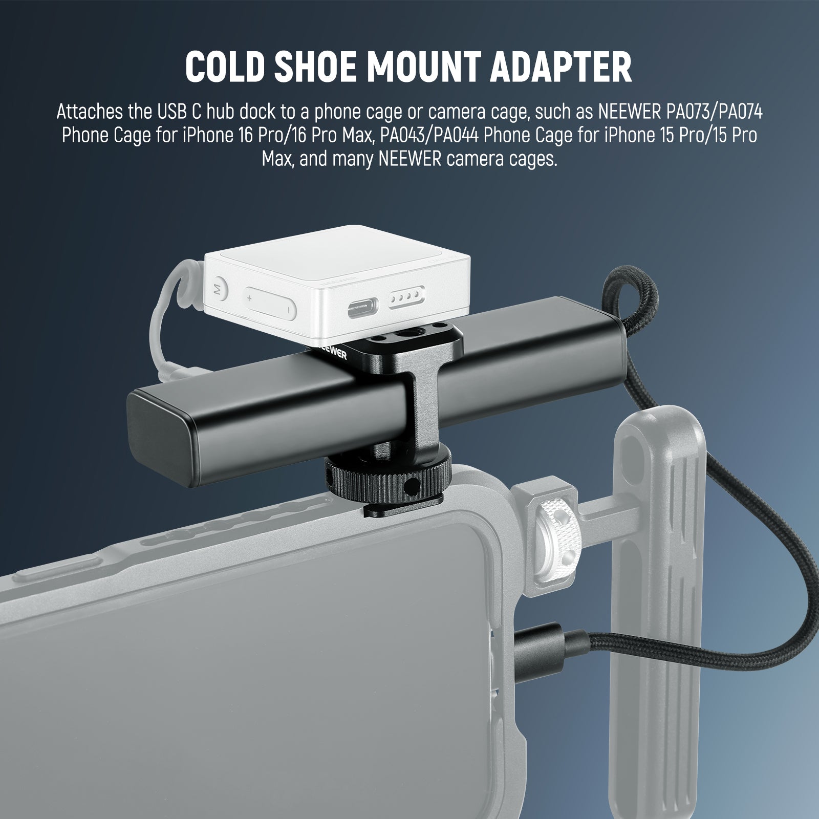 • Cold Shoe Mount Adapter- Attaches the USB C hub dock to a phone cage or camera cage, such as NEEWER PA073/PA074 Phone Cage for iPhone 16 Pro/16 Pro Max, PA043/PA044 Phone Cage for iPhone 15 Pro/15 Pro Max, and many NEEWER camera cages. Also compatible with SmallRig phone cages and camera cages