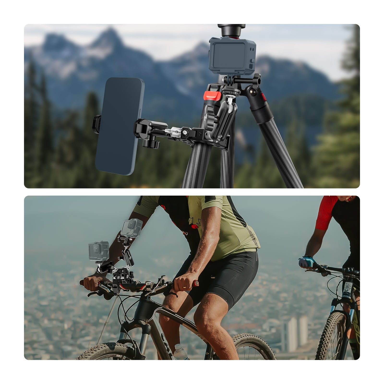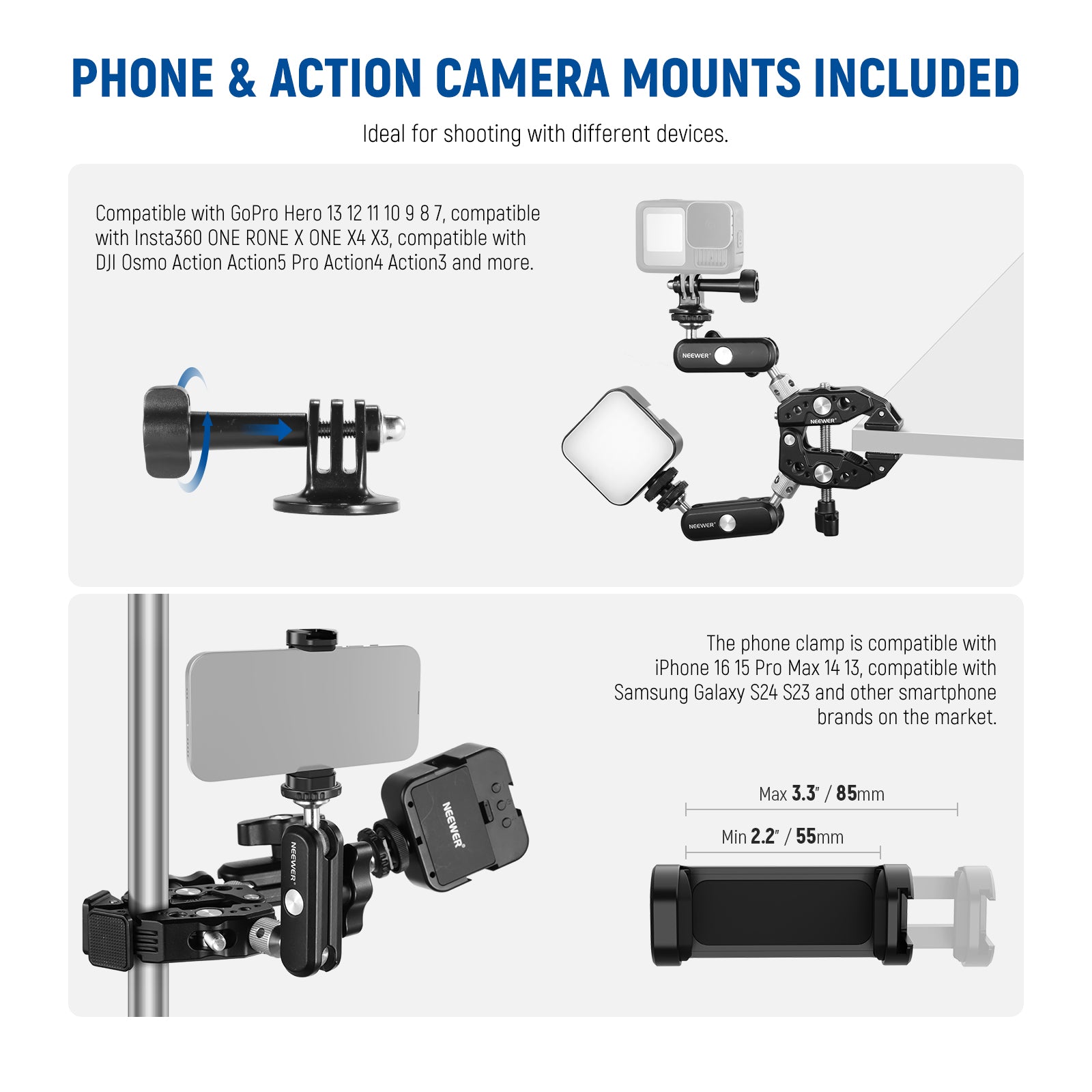 • Phone Holder & Action Camera Adapter Included- The 2.1"-3.3"/54-85mm adjustable phone holder is compatible with iPhone 15 Pro Max 14 13 Samsung Galaxy S24 S23. The action camera adapter is compatible with GoPro Hero 12 11 10 9 8 7 Black go pro max compatible with insta360 x4 x3 insta 360 ace pro compatible with DJI Osmo Action 4 3, etc. Several 1/4" and 3/8" threads and locating holes for ARRI are also for field monitors, LED video lights, microphones, etc.
