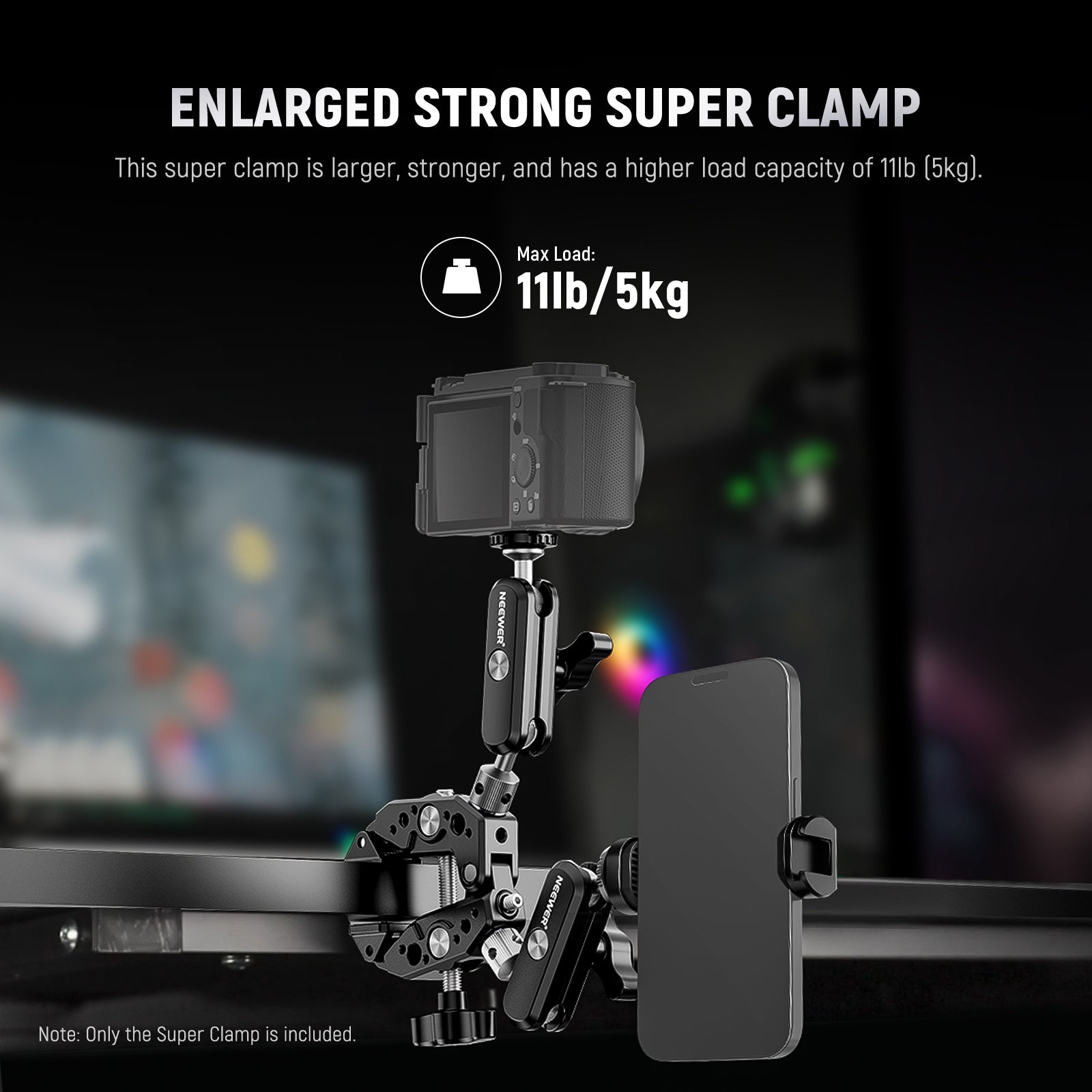 • Enlarged Strong Super Clamp- This enlarged super clamp is upgraded with an 11lb (5kg) high load capacity, supporting DSLR cameras, mirrorless cameras, field monitors, smartphones, action cameras, LED video lights, webcams, and other equipment or accessories, with an extra phone holder and action camera mount adapter for hassle free setup, making it a versatile mounting solution for photography, vlogging, live streaming, video conferencing, and other videography
