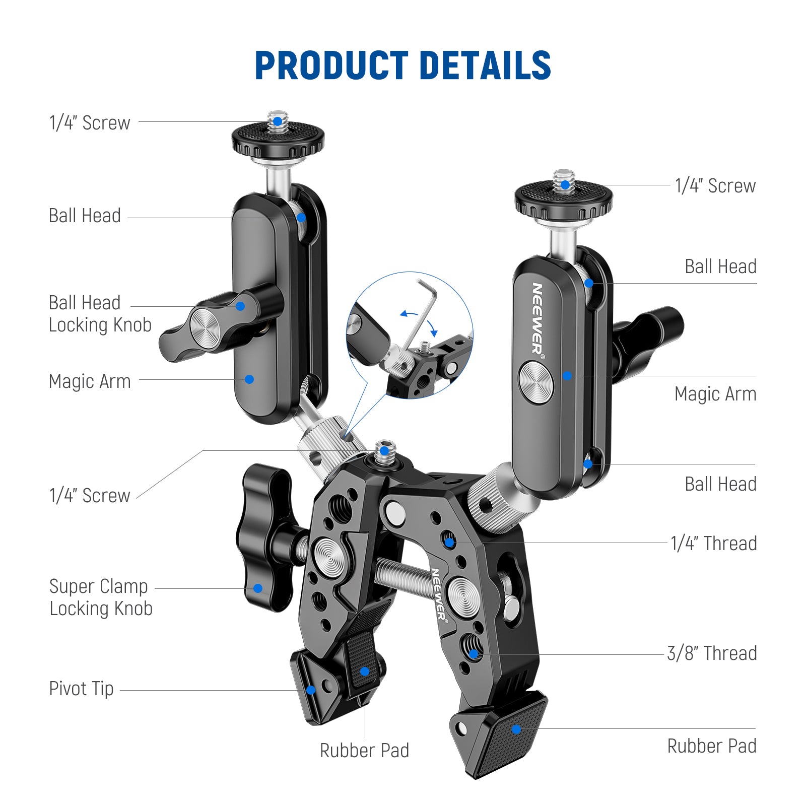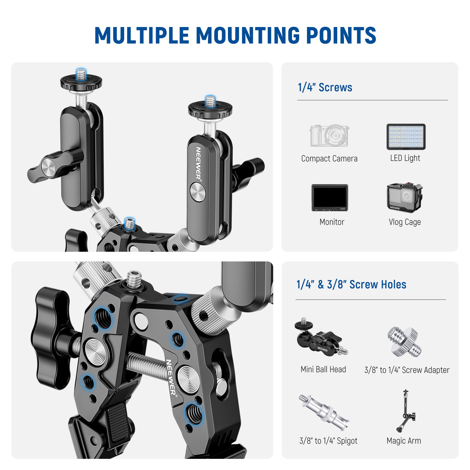 • Two Magic Arms with Dual Ball Heads- Double magic arms of this camera clamp mount allow you to mount two devices at the same time. The adjustable ball head structure enables 360° rotation for free device positioning, and 1/4" mounting screws suit various devices. Use locking knobs to adjust and secure magic arms with ease