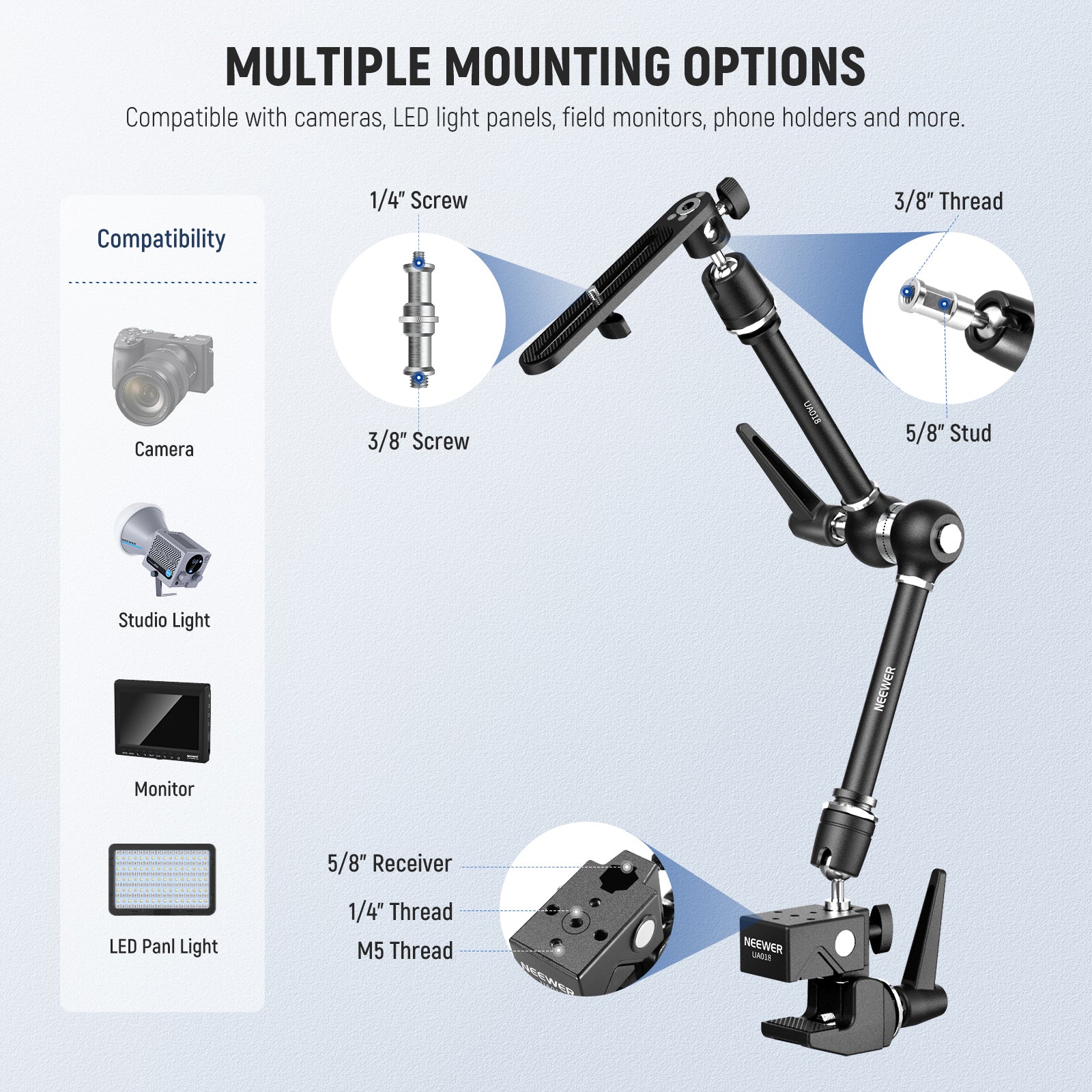 - Multiple Mounting Options- With a 3/8" to 5/8" stud on each end, the magic arm camera mount connects to the super clamp via its 5/8" hexagonal female adapter on one end, and the other end connects the mounting plate using a knob. Plus, the super clamp mount is also equipped with a 1/4" thread hole and four M5 threaded holes for more devices using the included 1/4" to 3/8" screw adapter. You can also mount the screw adapter at the top articulating arm for diverse mounting needs