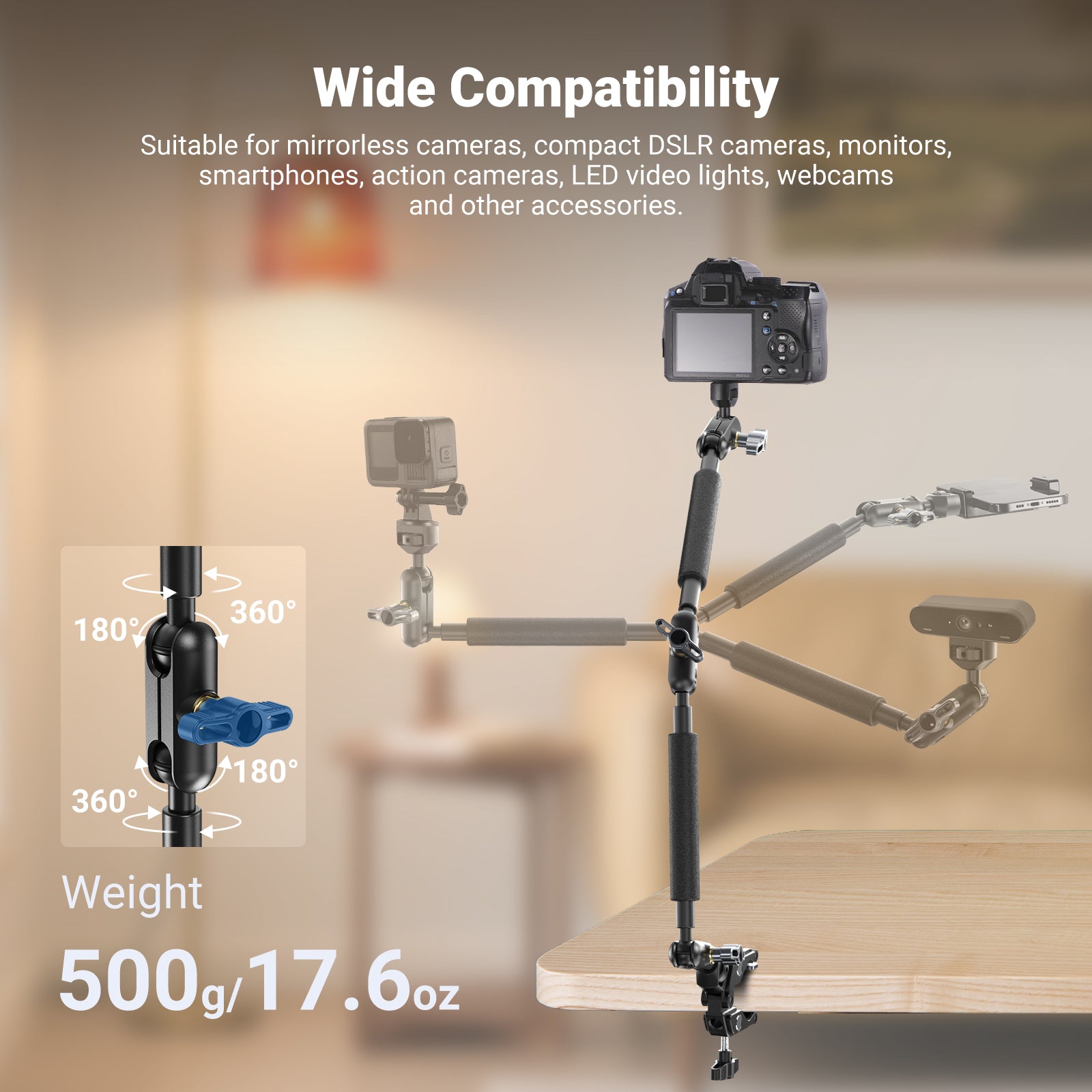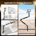 - Magic Arm with Super Clamp- Crafted from robust aluminum alloy, the low profile but super grip boom arm camera mount supports gear or equipment like DSLR mirrorless cams, action cameras, webcams, microphones (mics) or smartphones up to 500g/17.6oz. This table stand rig is ideal mounting accessories compatible with iPhone for overhead photography, vlogging, gaming, live streaming, video recording, Zoom calls and conferencing, videography, podcast, etc. Recommended for use in static situations