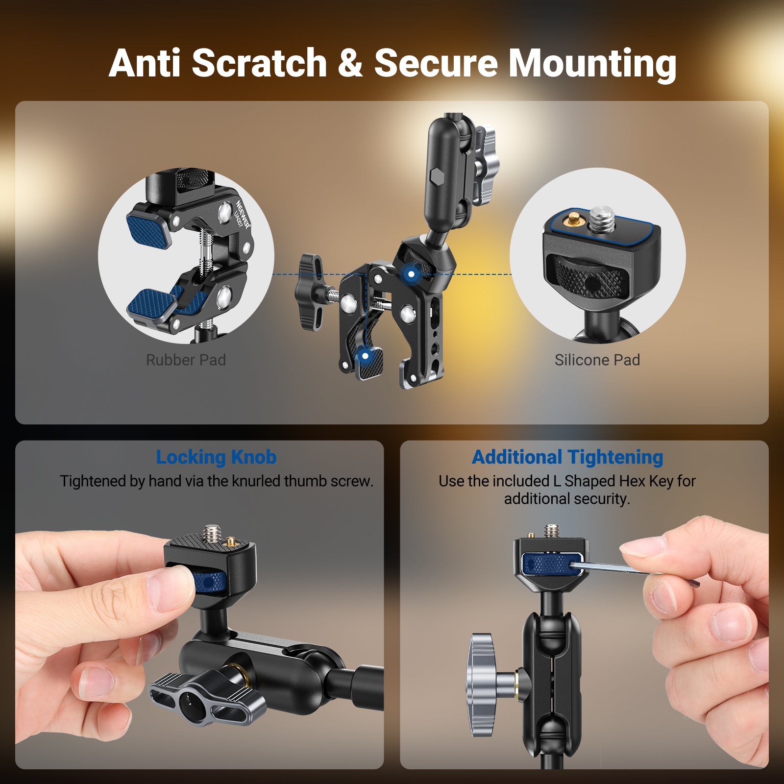 - Anti Twist & Stable Grip- The overhead camera mount has an anti twist pin on each mounting interface, to firmly connect the overhead phone mount with the super clamp and the mounted device. Even the super clamp is outfitted with non slip pads, protecting your device from scratches and preventing unwanted wobbling during shooting sessions