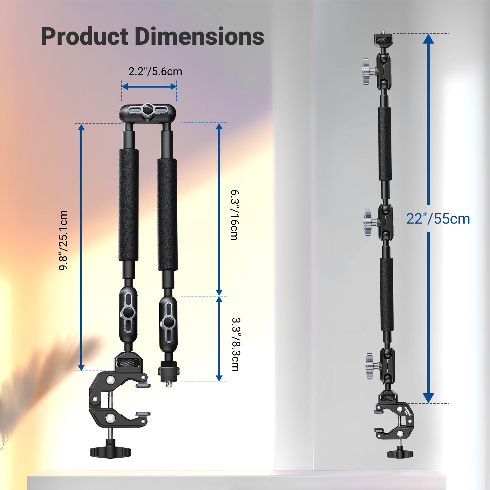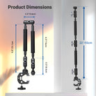 - Articulating Arm with Ball Heads- The two section friction boom arm offers a 55cm/22" extended length, and is equipped with three sets of 360° dual ball head adapters, enhancing the flexibility of angle and height, and secured with a simple twist of the locking knobs. Each ball head comes with multiple rubber rings to firmly grip your gear and prevent accidental drops