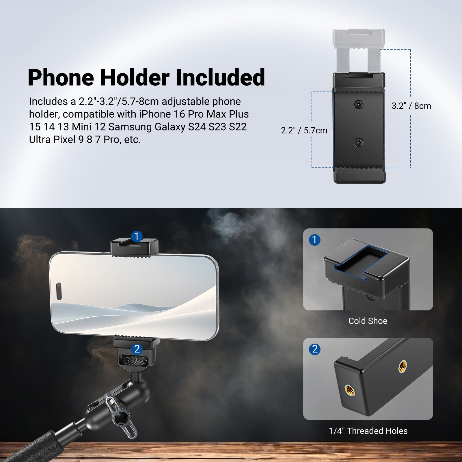 - Wide Compatibility- For LED lights, field monitors, action cameras, mount adapter accessories compatible with DJI Osmo Pocket 3 2 Creator Combo Action 5 Pro 4 Insta 360 X5 Insta360 X4 X3 Go 3S Ace Pro GoPro Hero 13 Go Pro 12 11 10 9 Black AKASO Brave 7 8 EK7000 etc. The 2.2"-3.2"/57-80mm phone holder is compatible with iPhone 16 Pro Max Plus 15 14 Mini Samsung Galaxy S25 S24 Ultra Google Pixel 9, etc., for photography, video recording, and filming creation