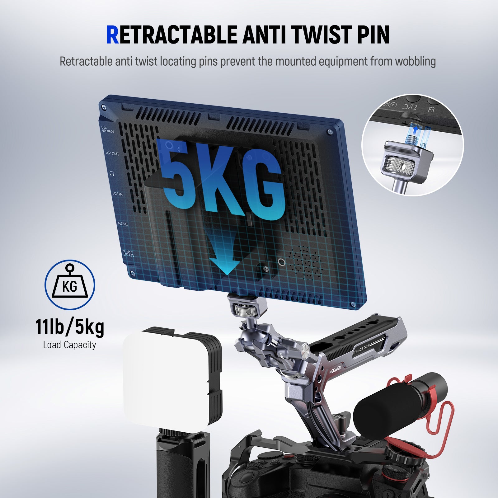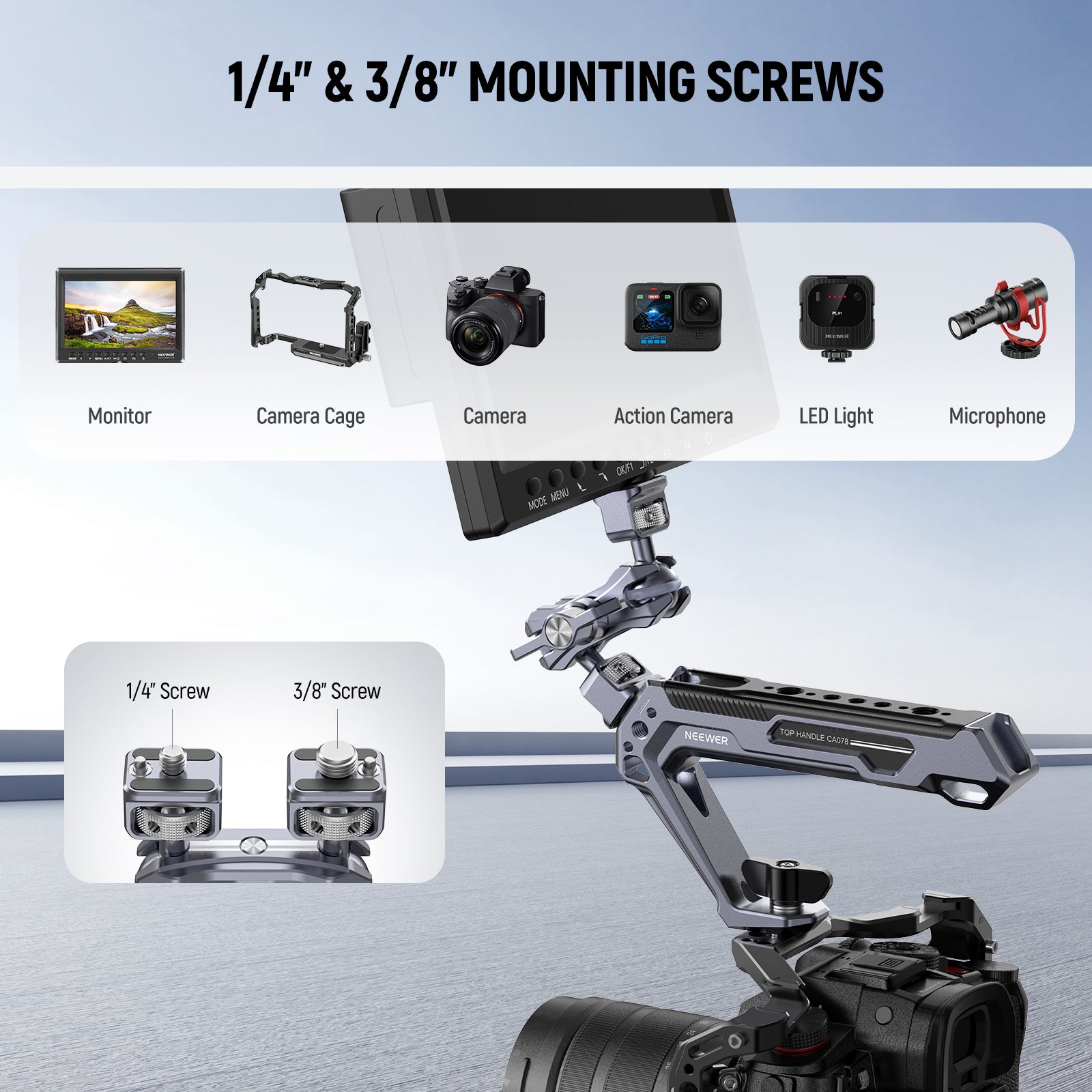 - 1/4" & 3/8" Mounting Screws- 1/4" and 3/8" screws are compatible with a range of devices up to 11lb/5kg, including field monitors, LED video lights, microphones, action cameras, and mirrorless cameras. Also compatible with SmallRig and NEEWER camera cages, video rigs, and super clamps
