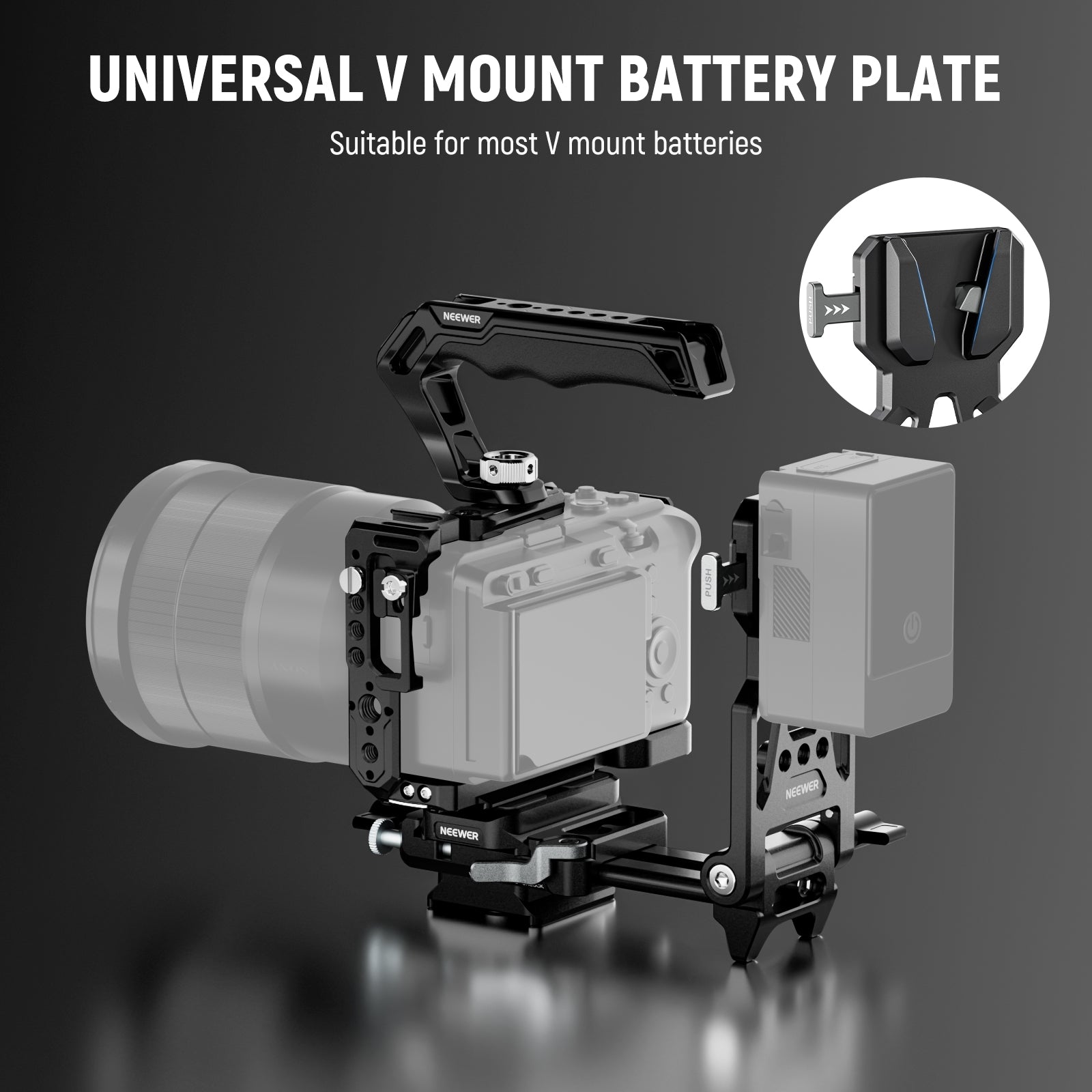 - Versatile V Mount Battery Plate- The PS150 Pro Battery Plate can simultaneously mount your camera and V mount battery for prolonged shooting sessions. It features two Arca type QR plates, 180° flexible battery positioning, and a 1.4"/36.5mm extendible baseplate that provides enough space for your rig. Note: Only compatible with NEEWER V mount batteries, including PS099E, PS099EP, PS150E, PS050E, PS099S