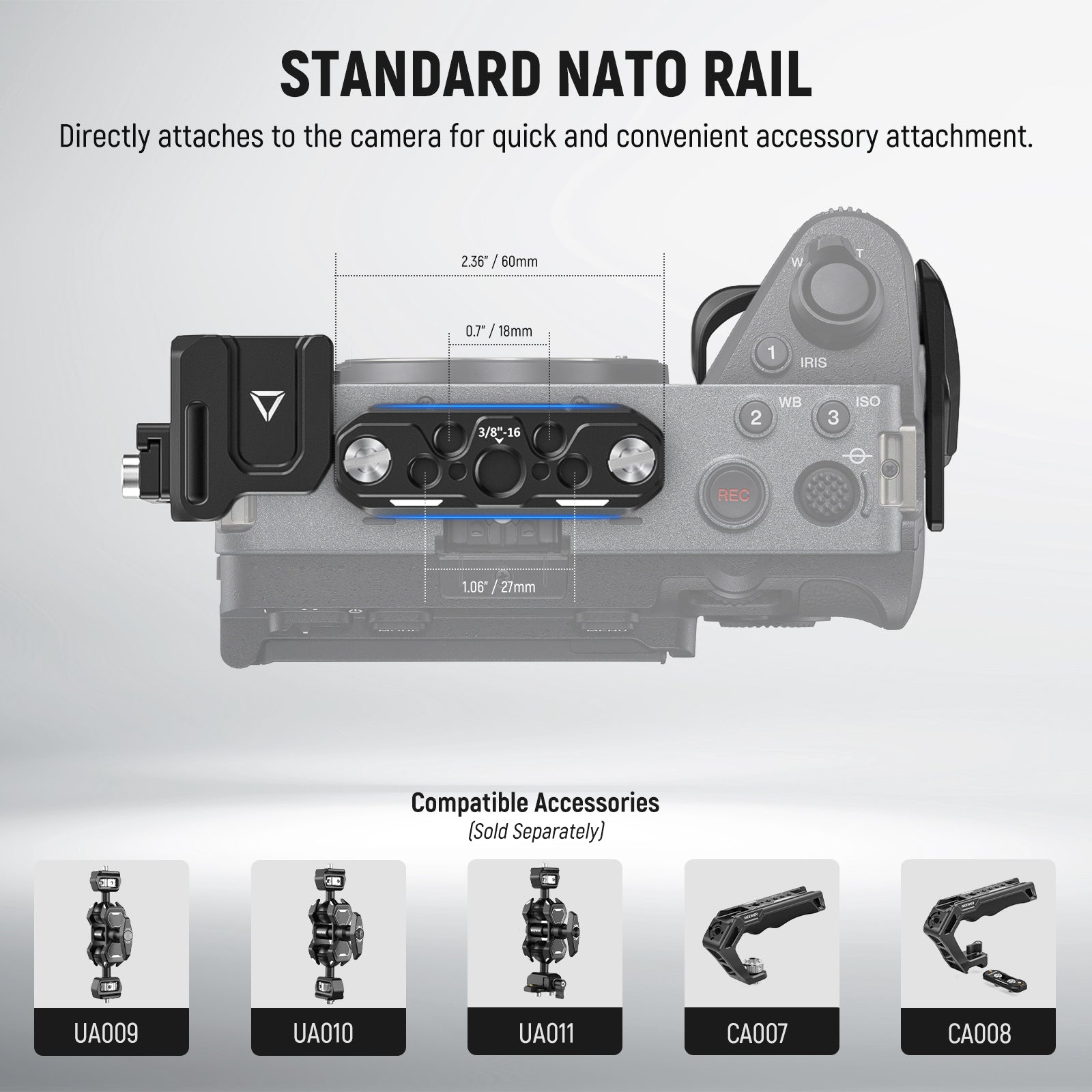 - Multiple Mounting Points- The cage offers various mounting points: an external NATO rail with 3/8" thread for CA007/CA008 Top Handle and MA020 Monitor Mount, a cold shoe for RGB62 LED Video Light and VM10 Mini Microphone, and several 1/4" and 3/8" threads for ST08 Magic Arm and more. Note: Except for CA007 Top Handle, all accessories are sold separately