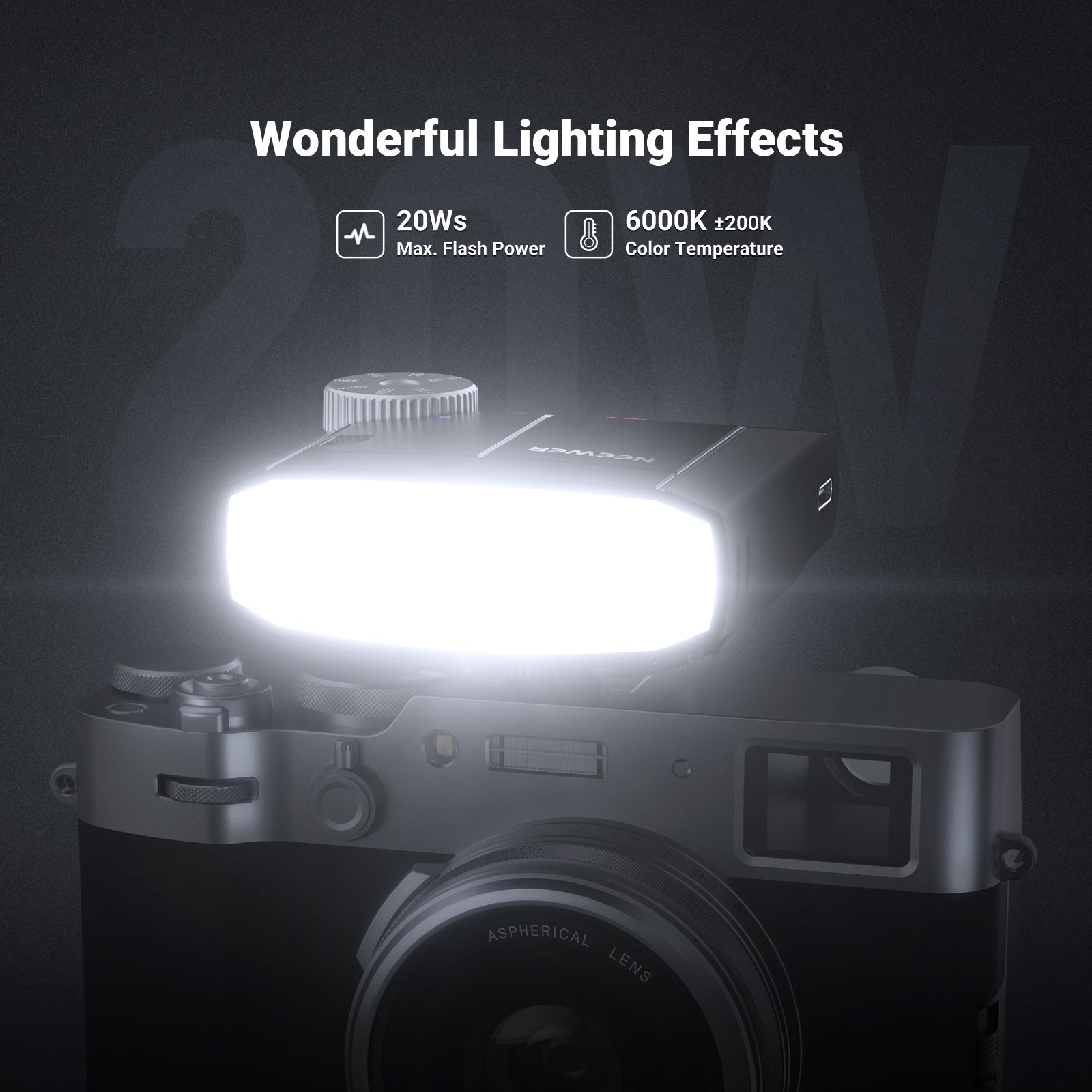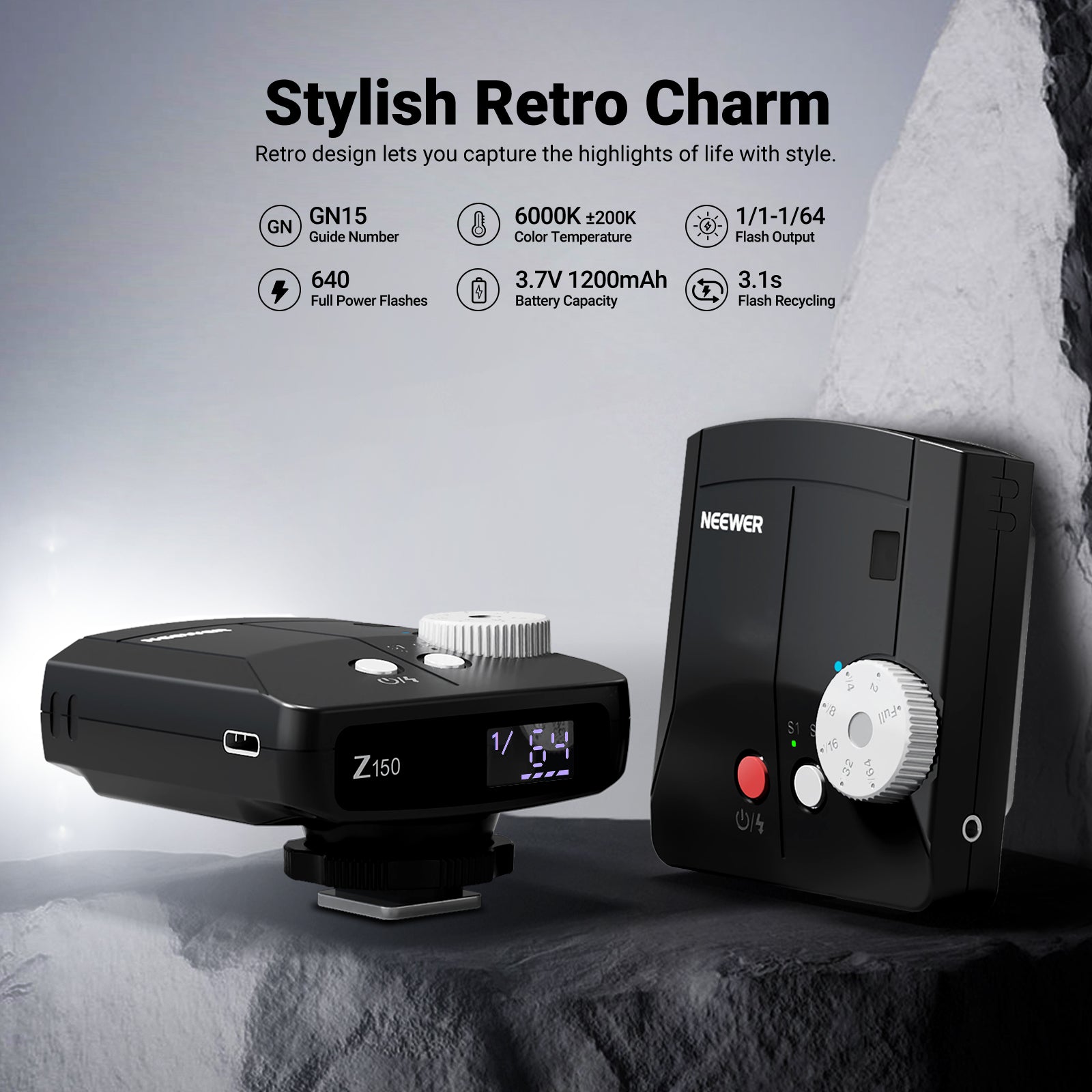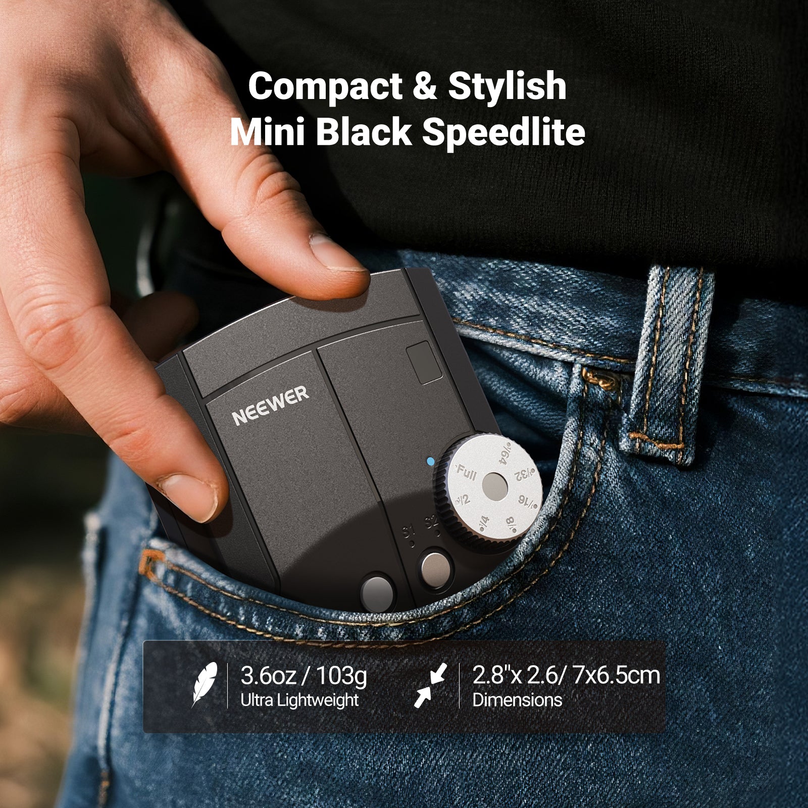 - Stylish Mini Black Speedlite- NEEWER Z150 is a pocket sized, lightweight (3.6oz/103g), retro style camera flash, more portable than studio strobe equipment. Its compact and vintage design complements your device, as content creator essential photoshoot light and influencer must have photo lighting gear for on the go photography