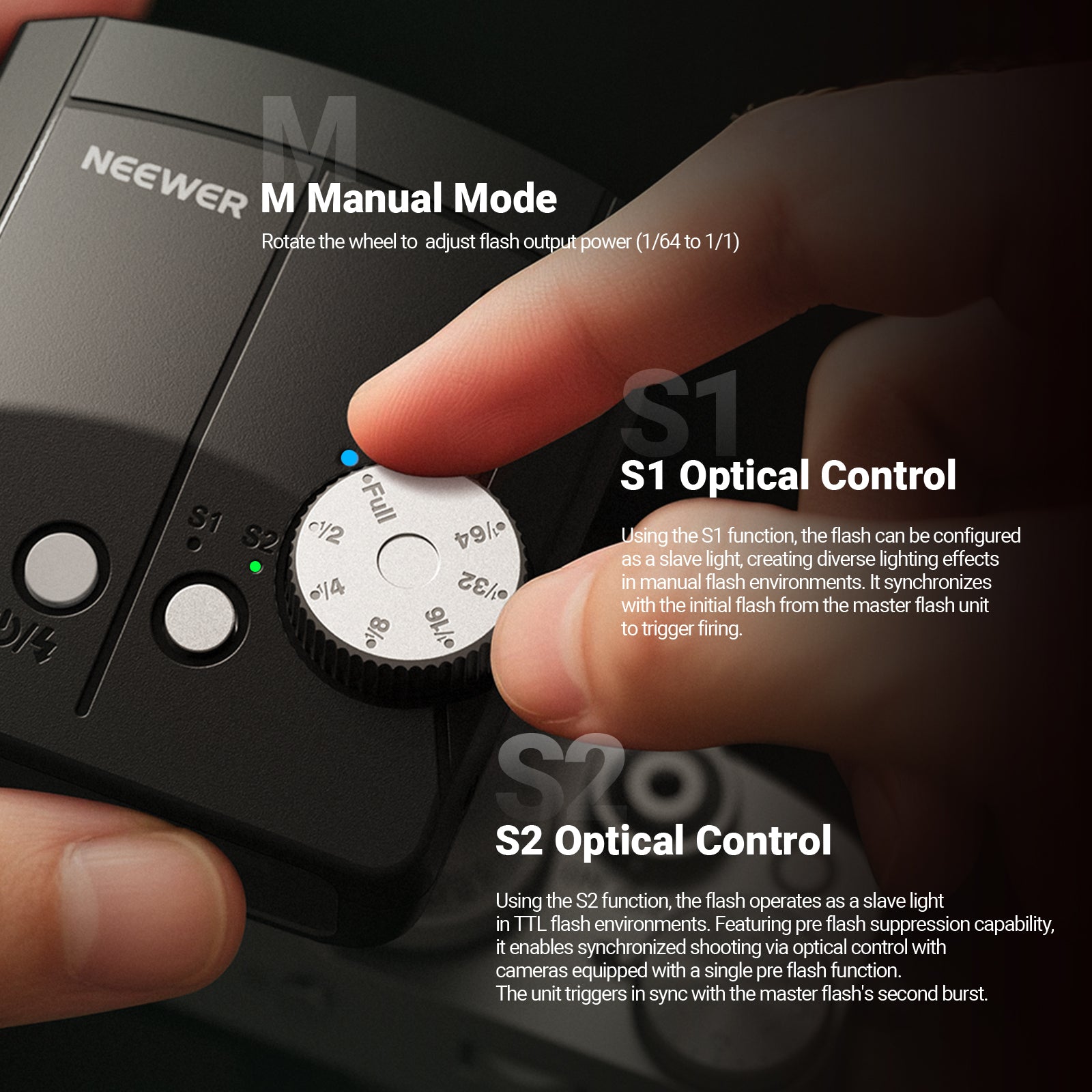 Manual/S1/S2 Flash Modes- This off camera flash offers three modes: Manual, S1, and S2. Adjust output from 1/64 to 1/1 in Manual mode. Use S1 or S2 optical slave modes for wireless triggering, with S2 designed to ignore preflashes in TTL setups.