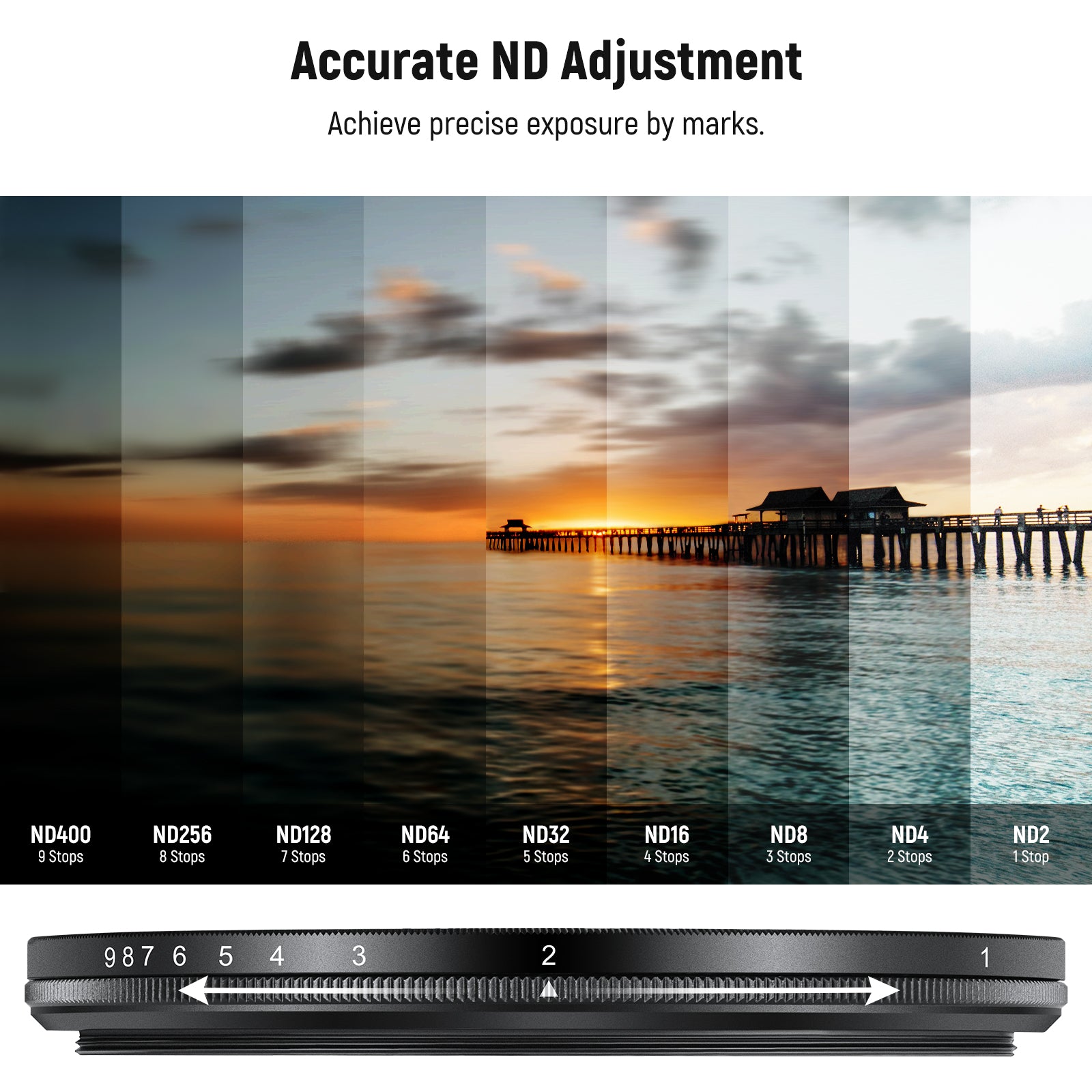 - Flexible Light Reduction- This variable ND2-400 filter reduces light by 1-9 stops. It can avoid overexposure across a variety of weather conditions and allows you to capture rivers, waterfalls, and light trails with motion blur by using slow shutter speeds and wide apertures. Simply rotate the frame to exact marks for precise exposure control