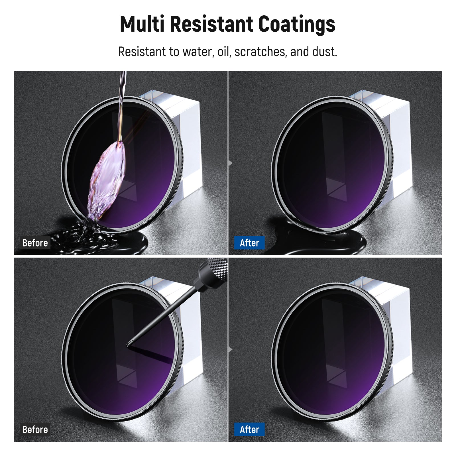 - Multicoated Optical Glass- Multiple resistant coatings (MRC) are resistant to water, dust, fingerprints, smudges, and scratches during outdoor shooting. Three cleaning cloths are included for daily maintenance