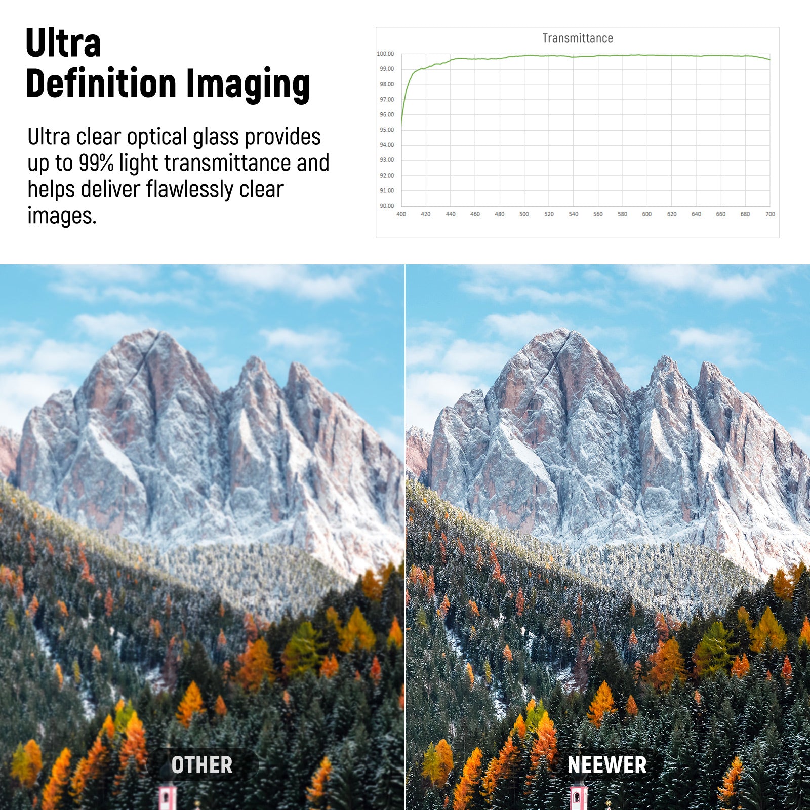 NEEWER camera filters offer a range of options, including ND, CPL, UV protection filters, and more. These lens filters enable you to capture breathtaking images and videos with precise lighting control and accurate color reproduction. Additionally, UV protection filters help protect your lens from damage. Choose a high-quality camera lens filter to elevate your photography.