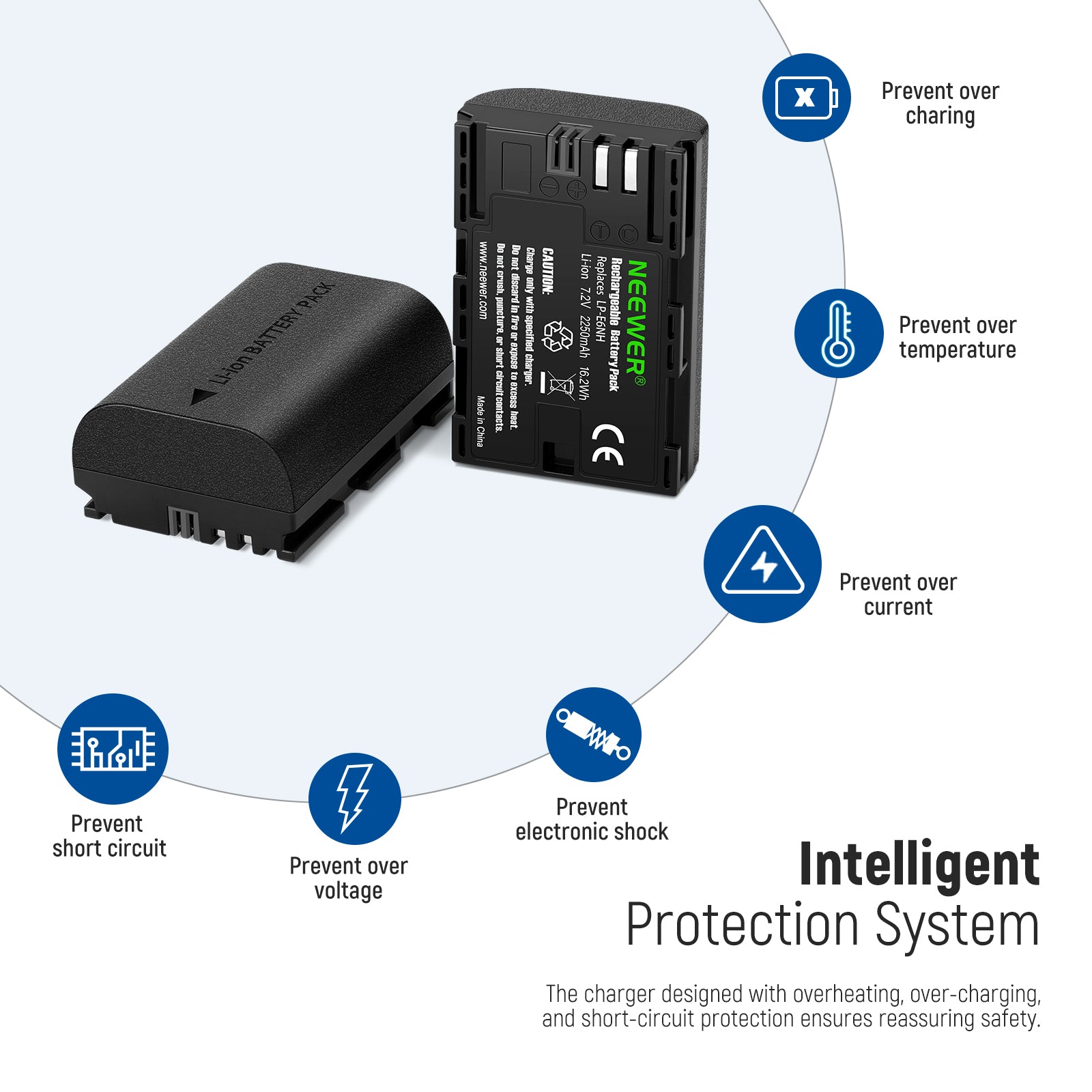 - Sufficient Battery Power- Do you want more battery power when shooting outside. Then this LP-E6NH replacement battery charger set is exactly what you need. Two 2250mAh rechargeable batteries provide longer battery life that helps take more photos and videos
