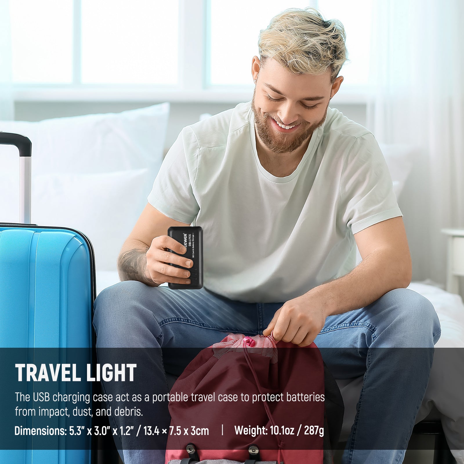 • Versatile Charging Case- Not just a charger. The USB charging case can simultaneously charge two batteries and act as a portable travel case to protect batteries from impact, dust, and debris. It also features two SD card holders and works as a portable charger for smartphones when batteries are installed inside