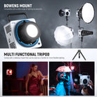 - Bowens Mount- Bowens mount and umbrella socket can connect softboxes, beauty dishes, snoots, and photography umbrellas for various light effects. The tripod stand mount adapter enables 360° angle adjustment, and the standard reflector can intensify the output and protect LEDs from damage