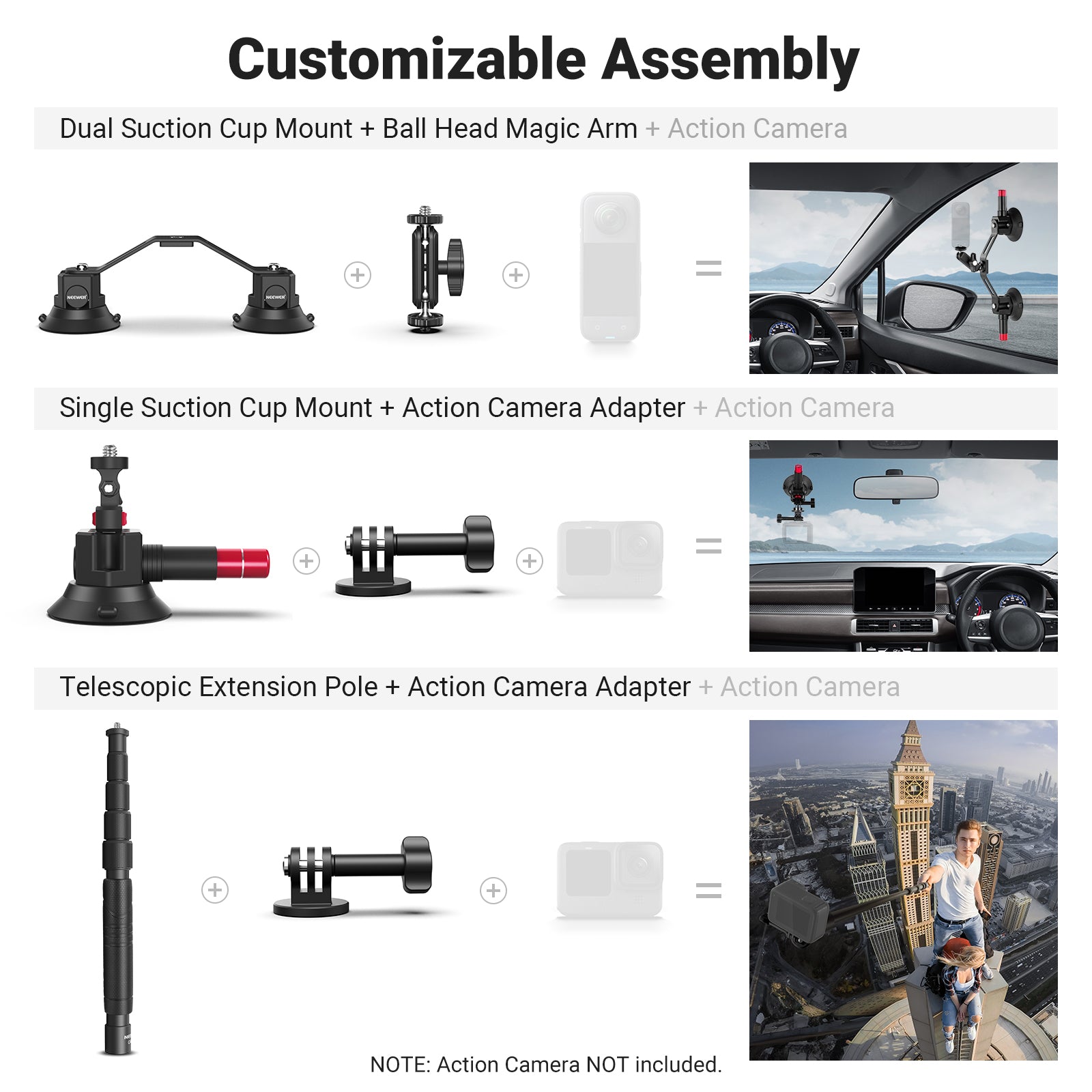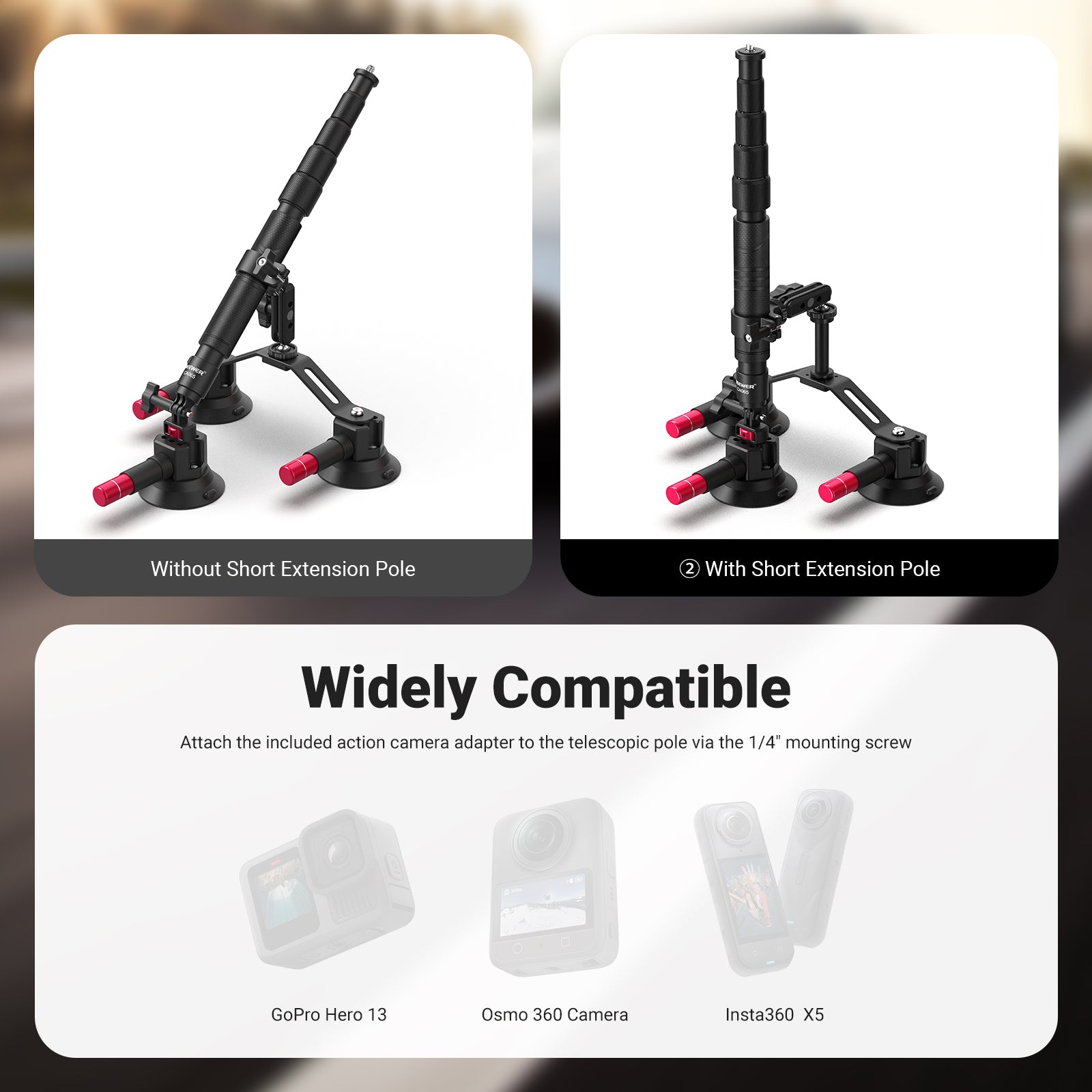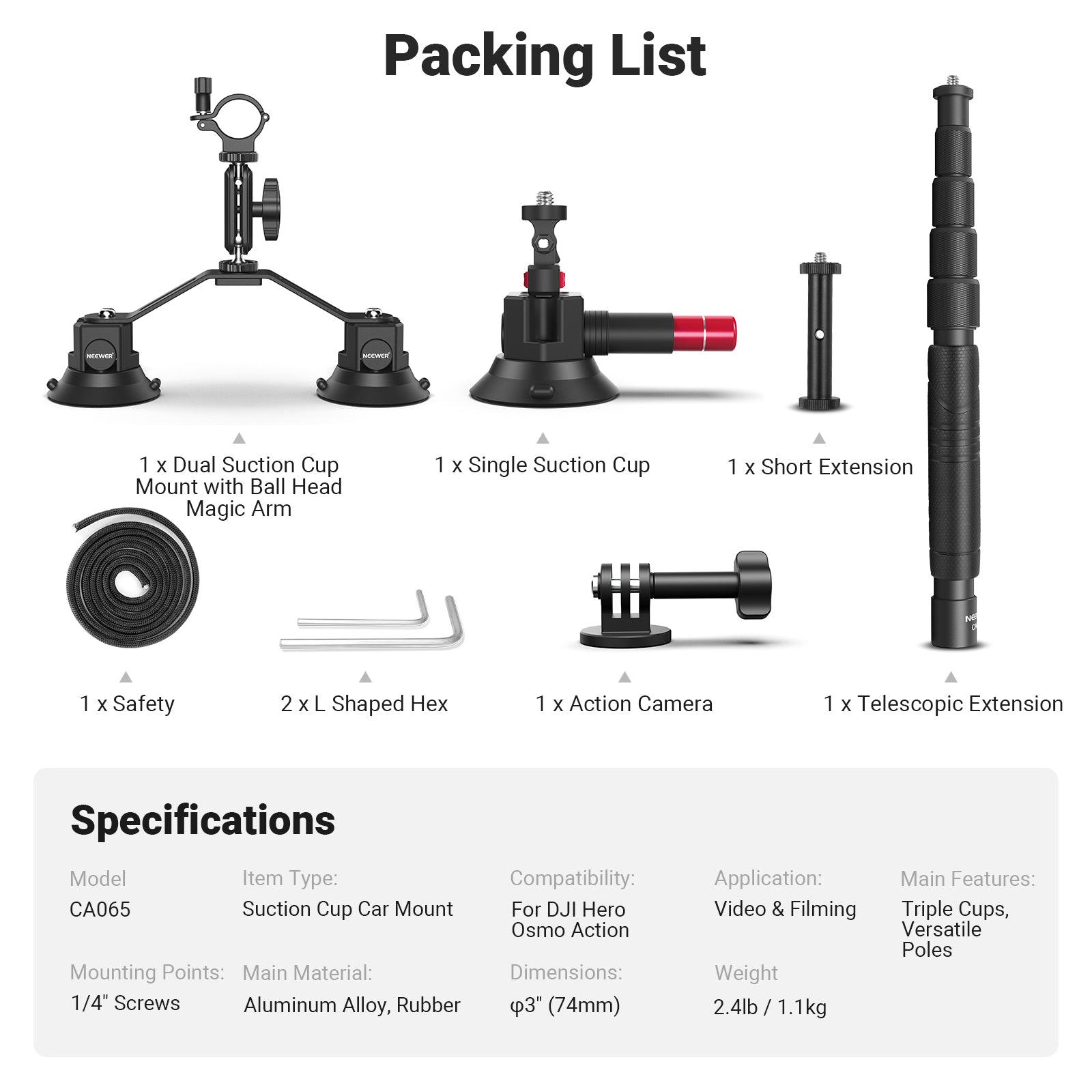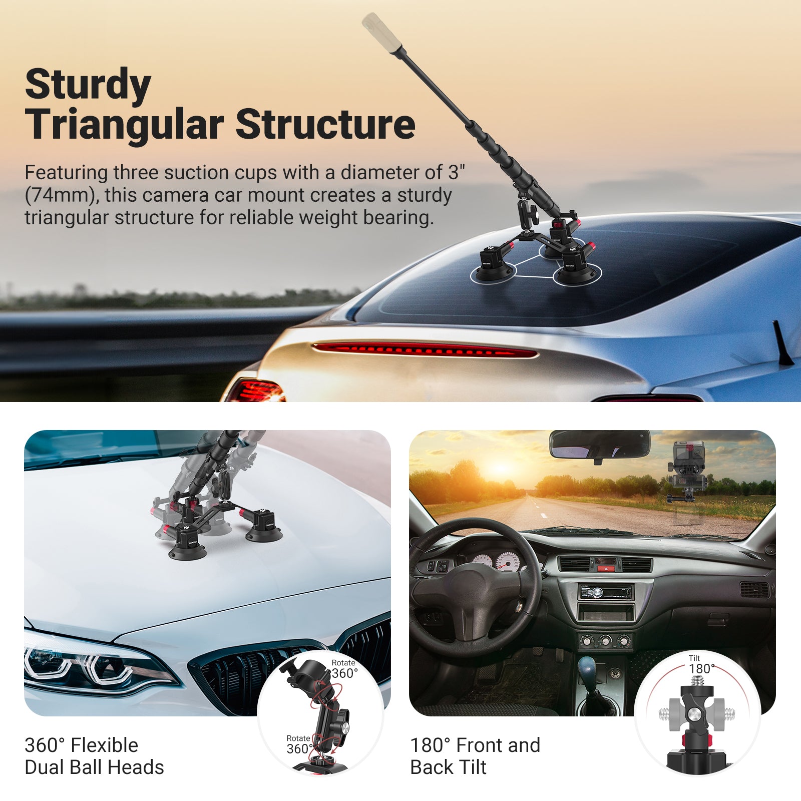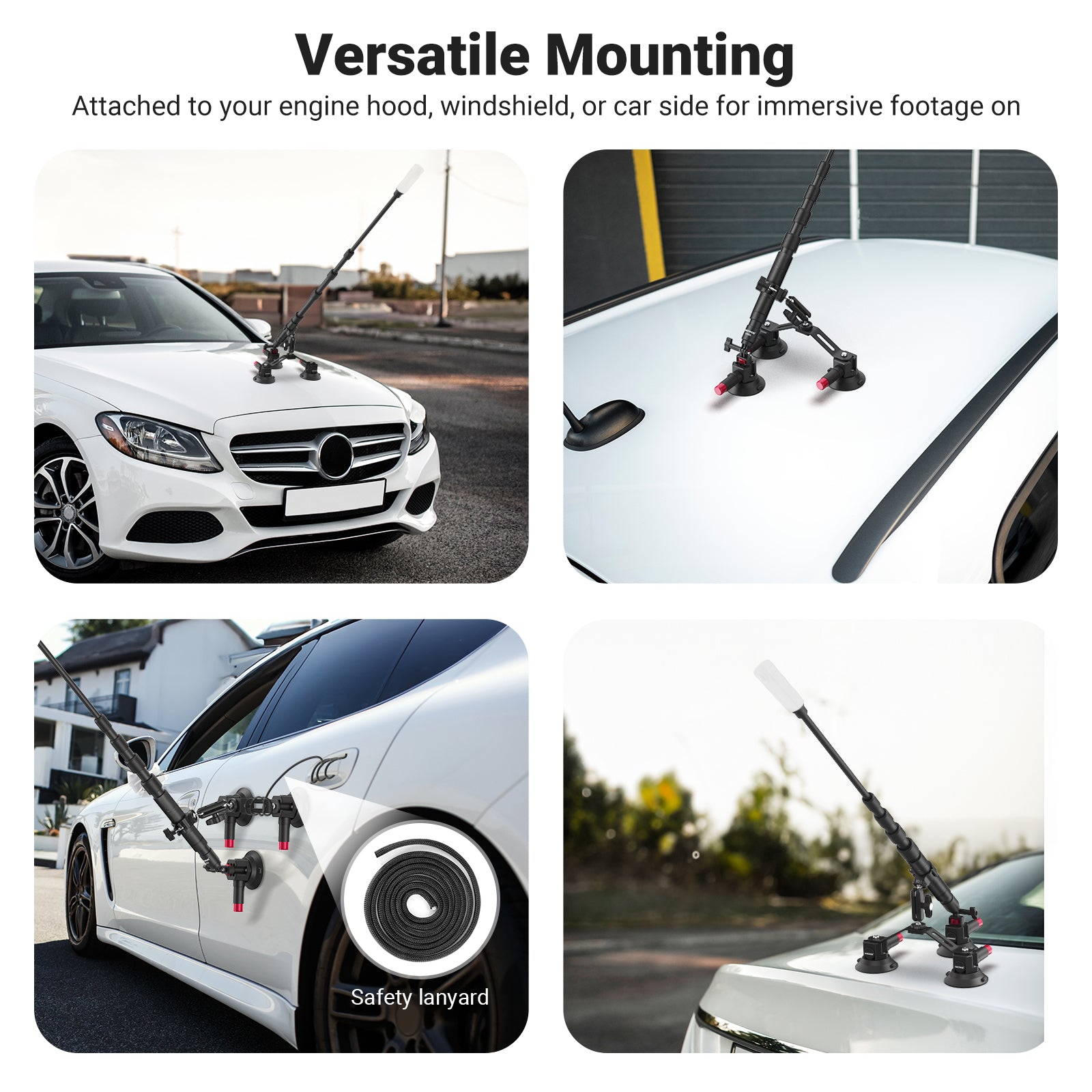 NEEWER offers powerful suction cup car mounts that securely hold mirrorless cameras, vlog cameras, action cameras, and smartphones on most smooth surfaces. With full 360° rotation, these versatile mounts let you capture unique driving angles from your car’s hood, windshield, or side panels for immersive road footage. Built from durable, weather-resistant materials, NEEWER suction mounts provide reliable performance in any outdoor environment. Explore our collection to find the perfect car camera mount for your next adventure.