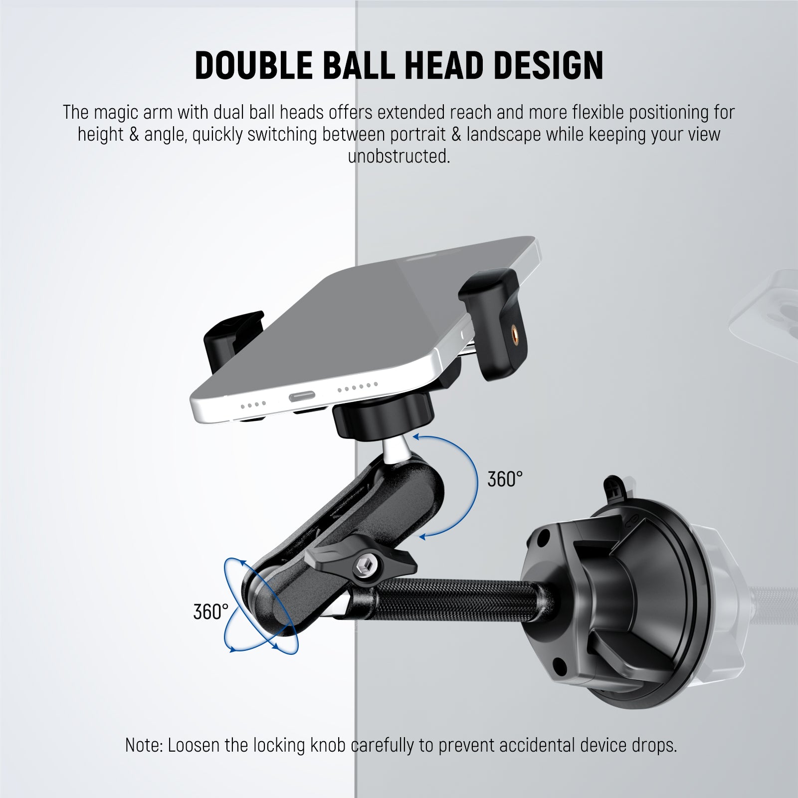 - 360° Rotation & Unobstructed View- The triple ball head system offers flexible positioning for height and angle, with quick switching between portrait and landscape modes while keeping your line of sight unobstructed. Metal knobs securely lock the joints